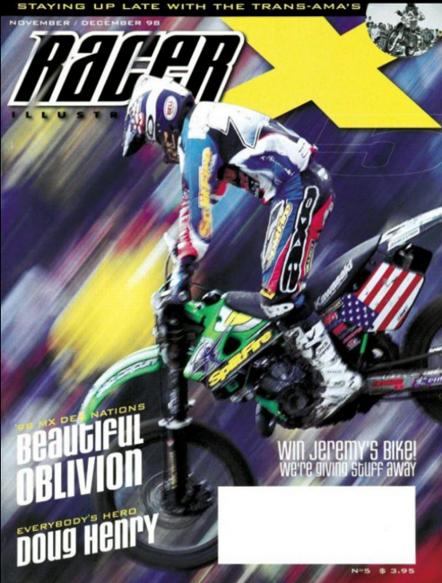 As we mentioned above, Carmichael was the first Pro Circuit rider to appear on the cover of Racer X Illustrated. The photo is from the 1998 Motocross des Nations where Team USA lost to the Belgium squad Marnicq Bervoets, Stefan Everts, and Joel Smets at Foxhills in Great Britain. Carmichael would exact revenge two years later at Saint-Jean-d’Angely, France, alongside Ryan Hughes and Travis Pastrana. This shot from Foxhills was made by Dangerous Joe Bonnello.