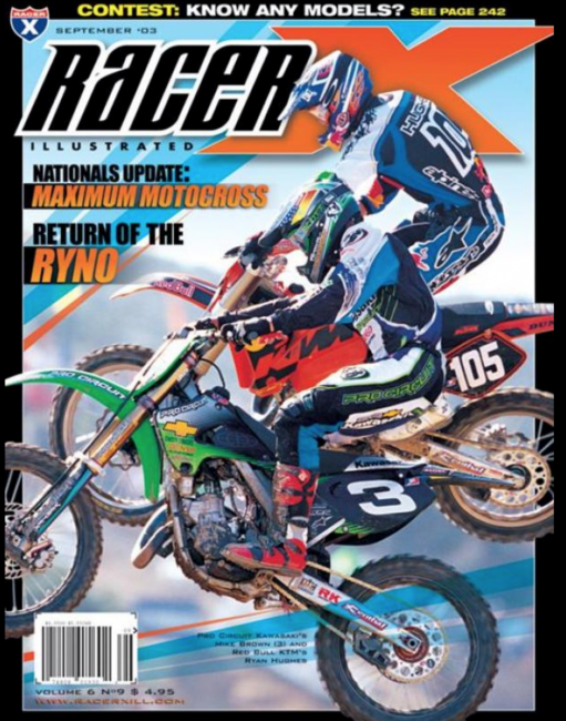 Mike Brown shared the September 2003 cover with Ryan Hughes. The two, along with Grant Langston, dueled for the AMA 125 Motocross title that summer, with Langston topping Hughes in dramatic fashion by just 7 points (the final race didn’t even take place due to a flood in Troy, Ohio). This Simon Cudby photo was shot at Glen Helen early in that series.