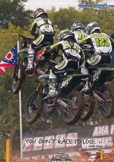 And while this wasn’t a front cover shot, it should have been, and it deserves honorable mention here as quite possibly the best photograph to express Pro Circuit’s long and competitive history in SX and MX. It was shot by Simon Cudby on the first lap of the 2007 Freestone National, coming out of the second turn. Villopoto and Ben Townley lead Austin Stroupe (981) and Brett Metcalfe (123) in a single frame—it was not a Photoshopped or otherwise manipulated! But before we could get our hands on it, Dean Jocic and the gang at Renthal saw it and begged Simon to use it for their fall advertising campaign, since all four were not only PC frontrunners, they were using Renthal. And the quote on the bottom from Mitch—“You don’t race to lose.”—is pure Payton!
