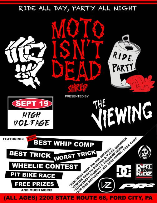 The Moto Isn't Dead Shred ride party will take place this weekend, Saturday 19 at High Voltage MX in Ford City, Pennsylvania. Riding begins at 9 a.m. and is being put on by Darryn Durham and Tyler Bereman.