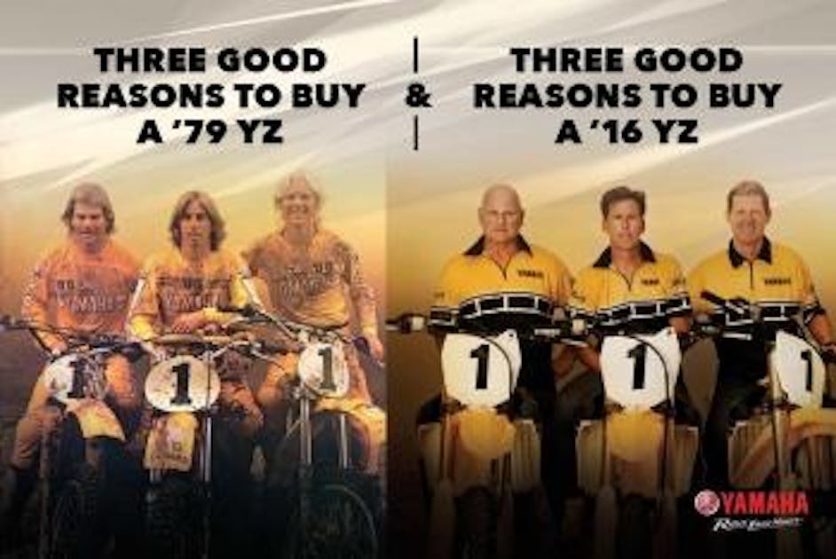 Throwing their legs over three 60th anniversary yellow-and-black 2016 YZs while wearing matching yellow-and-black team apparel, Yamaha’s “triple threat” struck the same pose that they did in 1979, in a spot-on re-creation of an ad that was displayed on the walls of many a motocross fan back in the day.