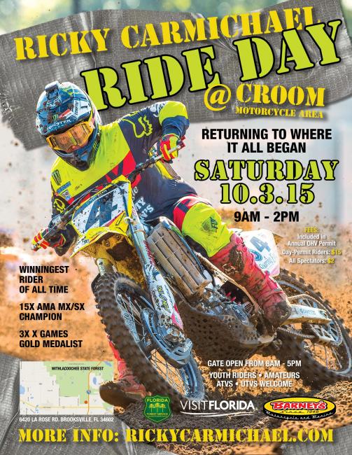 Next weekend, the GOAT, Ricky Carmichael, is having a ride day in Brooksville, Florida, in conjunction with the forest service to promote state-owned off-road areas. Details are below; make sure to check it out.