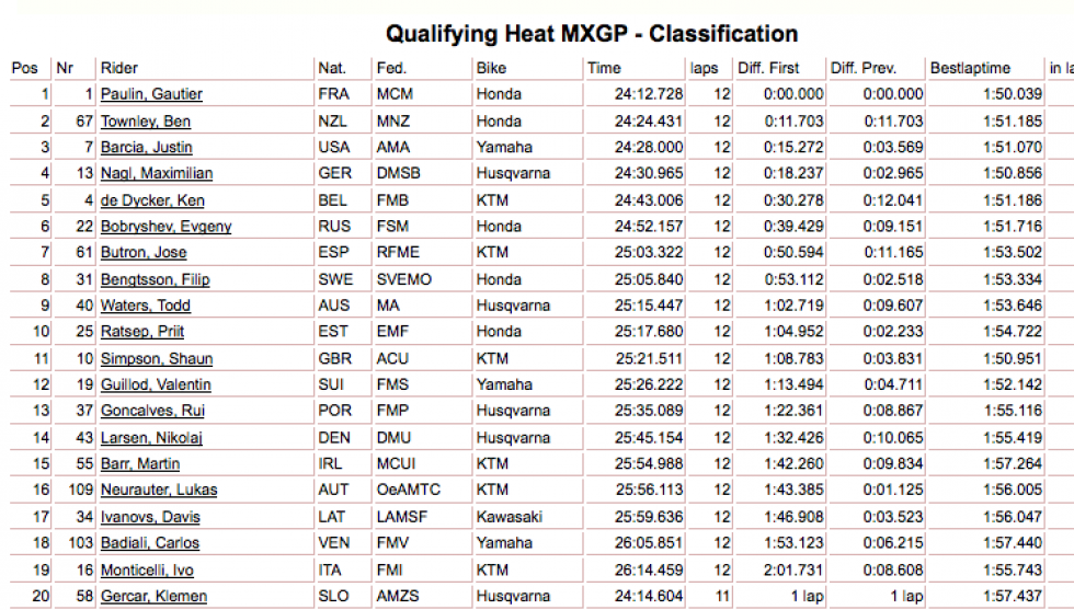 Febvre started in fourth as Cooper Webb put Team USA at the front for the first time, and the Frenchman was assisted by a tip-over on the first lap by FIM MX2 World Motocross Champion Tim Gajser. The MXGP #1 had to shut down a gap of four seconds to the American, and the pair swapped positions three times in a repeat of their close tussle at Glen Helen last week. Webb bobbled out of a rut at the bottom of the hill, and with the full heat of the French crowd upon him (Paulin: "The public is just crazy. Every time you get close it is just 'wah!' It is like a great energy in your body and a lovely feeling. A great atmosphere."), Febvre was away, but Webb mounted a comeback to retake the lead, with the Frenchman then fighting back to make a final pass. From there, he was away and en route to completing a French sweep of all three qualification heats.