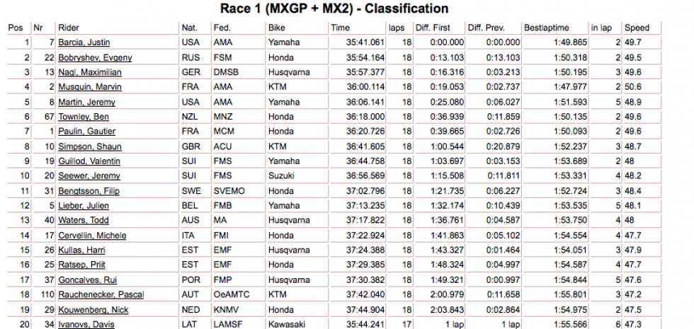 Barcia scored a huge moto win up front, the first for Team USA since the final moto of the 2011 event (Ryan Villopoto). Combined with Martin's fifth and 4-7 scores for the French, and Team USA leads France 6 to 11 in the standings after moto one.