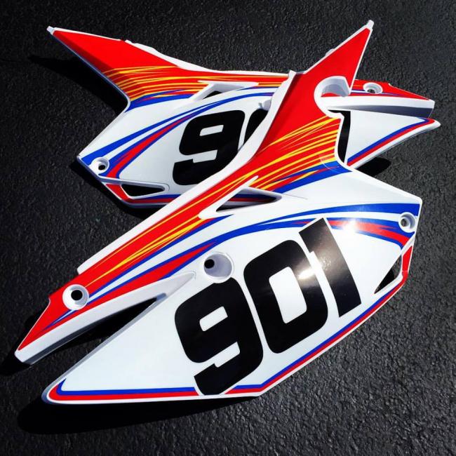 Chicago, IL – DeCal Works, the original and still number-one graphic and number company, has created a brand new, more aggressive set of side plates for 2014-'16 CRF250 or 2013-16 CRF450. The V2 updated one-piece side plates have a more aggressive appearance while retaining the one-piece construction; the airbox and side plate are molded together for ease of graphic application.