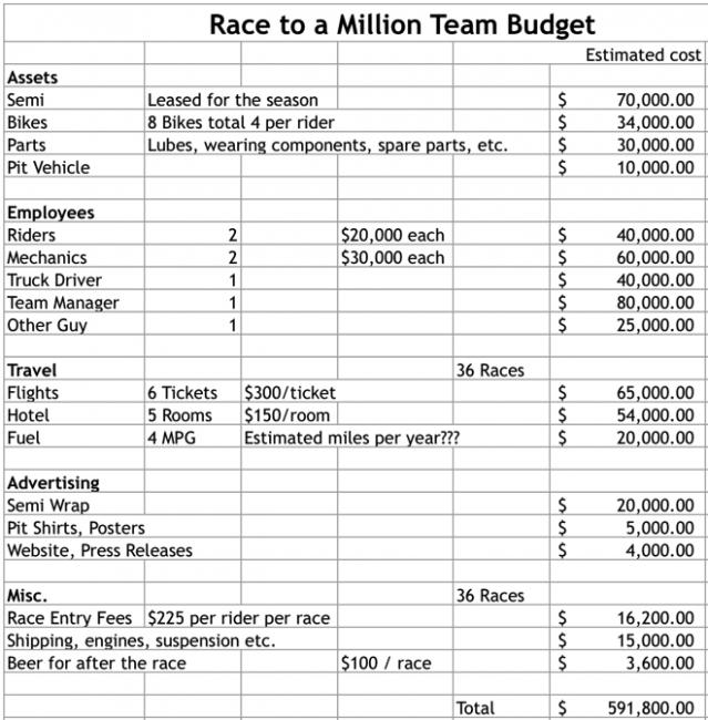 Racing is expensive. This much is pretty obvious. Travel, bikes, salaries, parts, etc. quickly drop your profit margin into the red. Compared to other forms of motorsports racing, motocross and supercross are quite cheap. Jalopnik recently received unprecedented access to a team in the Prototype Challenge class of IMSA’s Tudor United Sports Car Championship and found out that it costs $150,000 for one race! Earlier this week, Pulpmx got former team owner Alan Brown to draw out the details on how you would spend 1 million on a budget. There were two caveats: the budget was for a two-rider 450 team that would race both Monster Energy Supercross and Lucas Oil Pro Motocross, and the riders would have to be consistent main-event guys. Check out the hypothetical budget that Moser came up with below.