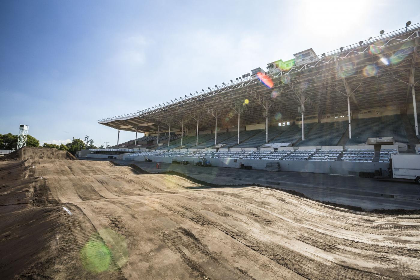 When we spoke with Jason Baker of Dream Traxx earlier this week, the designer of the Red Bull Straight Rhythm course was clear that the track would look different from a year ago, "You'll be able to tell it's the 2015 track versus the 2014 track as soon as you glance at it." Judging by the early pictures below, the track looks much different from the inaugural race. Baker, who works with a number of riders and teams, also said safety is their number-one priority for the event. "I think that's the true challenge—making it technical enough to be a good race but also letting them carry some speed, but not doing too much of either," he said. Another change this year will be the start, which will feature fourteen feet of elevation before riders drop down over a gap to get back to the ground. Also, look for a different ending, as riders will face a rhythm-lane-option section before the finish, as opposed to whoops a year ago.