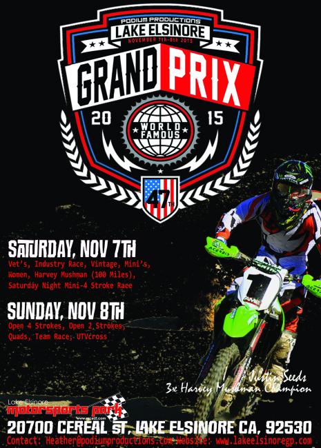 The City of Lake Elsinore approved the 47th Annual Lake Elsinore Grand Prix to be hosted by Podium Productions at the Lake Elsinore Motorsports Park, on November 7-8, 2015. A custom grand prix course will be designed to provide competitive racing that will be televised on MAVTV. The LEGP offers eighty-four classes accommodating motocross, quads, UTVs, vintage, and minis. And there will be a few new races added this year: the Industry class for those that work behind the scenes to make our sport the greatest in the world, a Fire and Police class to honor our first responders, and a Kids' UTV class.