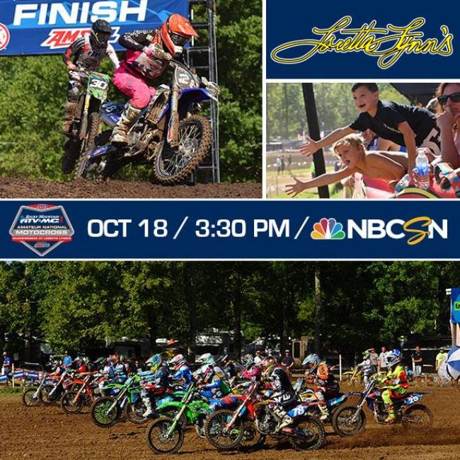 This Sunday, October 18 at 3:30 p.m. EST, NBCSN will air the second cable television feature from the 2015 Rocky Mountain ATV/MC AMA Amateur National Motocross Championship, presented by AMSOIL, which took place July 26 through August 1 at the historic Loretta Lynn Ranch in Hurricane Mills, Tennessee.
