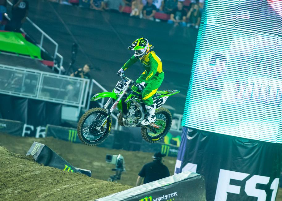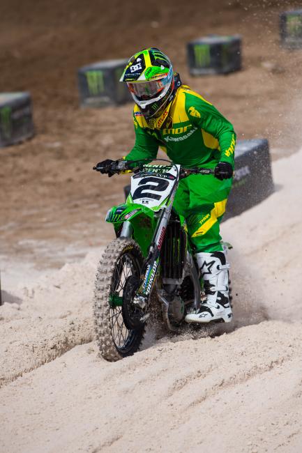 It took us as a bit of a surprise this past Saturday at the Monster Energy Cup in Las Vegas that Villopoto not only greeted the crowd during opening ceremonies, but suited up in his racing gear and climbed aboard a full-on Monster Energy Kawasaki works KX450F to go out in the two Cup Class timed practice sessions. On the same second as the times posted by Ken Roczen, Ryan Dungey, Chad Reed, Justin Barcia—not to mention all others—it was apparent RV still had the right stuff.