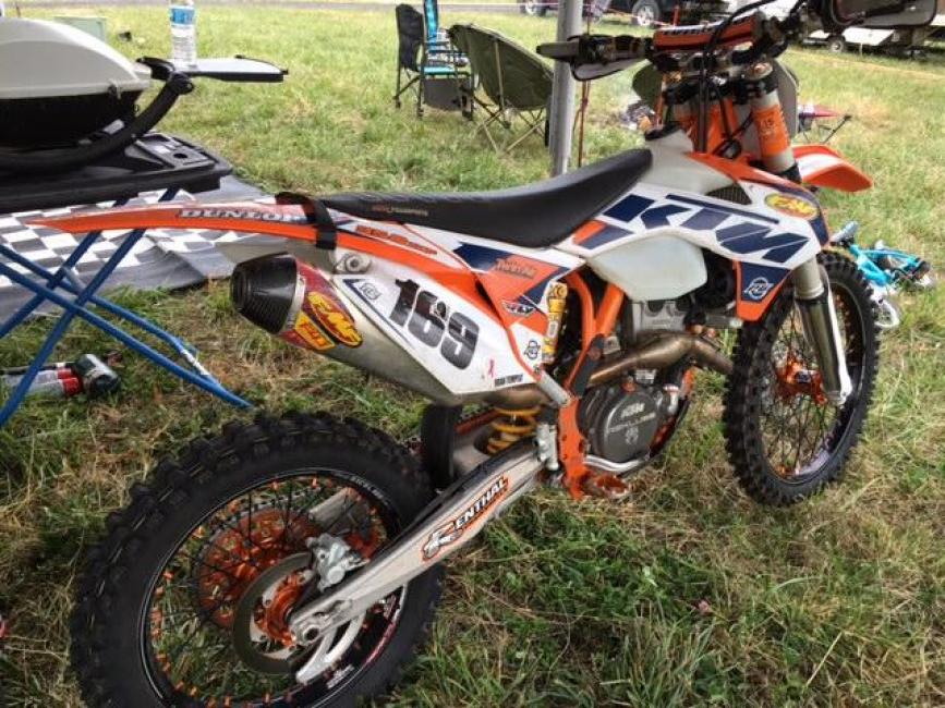 - Modifications at the time the bike was stolen include Ohlins suspension with gold fork tube tops, a Rekluse clutch cover, FMF exhaust, black wheels with orange hubs, aftermarket footpegs, Factory FMF/KTM team graphics, Renthal bars, bark busters