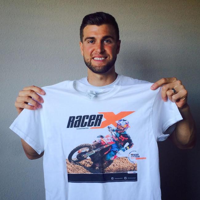 Back here on the home front we’re just going through the brand new issue of Racer X Illustrated, which features our 2015 Racer X Rider of the Year, Red Bull KTM’s Ryan Dungey. RD5 (or RD1 next year) swept the Monster Energy AMA Supercross Championship and the Lucas Oil AMA Pro Motocross Championship, and he threw in an ESPY Award to boot. We let Ryan know that he won the award, which really should not have been a surprise, and he responded with a very cool note and a shot of him holding up his Cover T that we will be giving away to every new (or renewed) paid subscription.(More on that promotional offer below.)