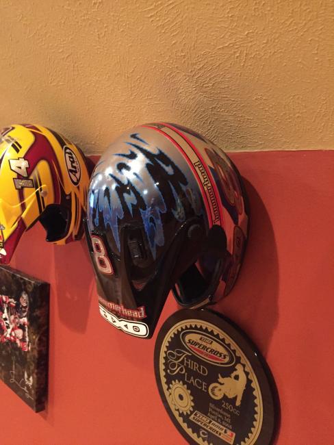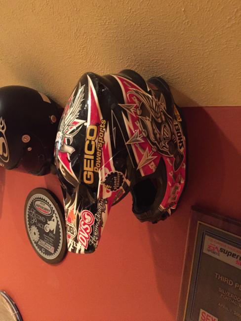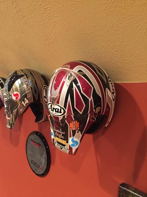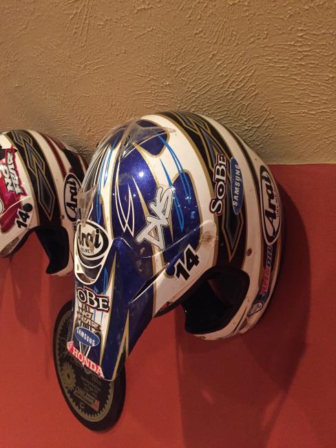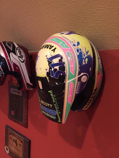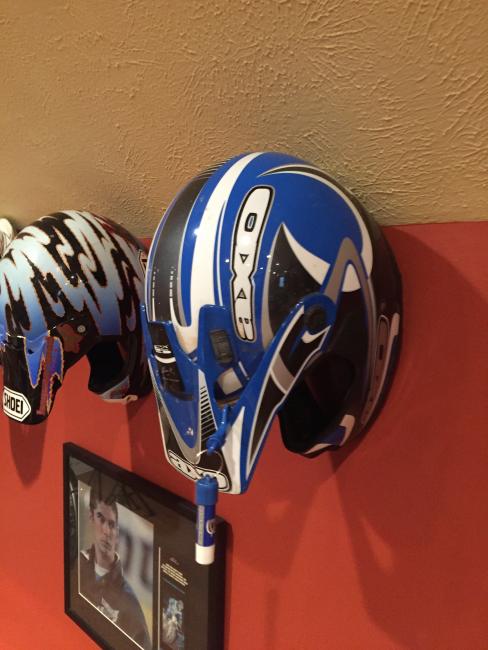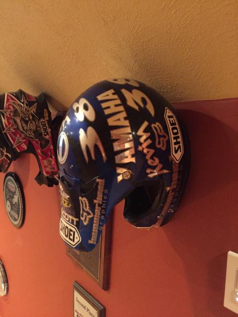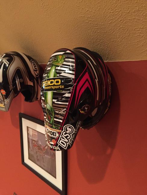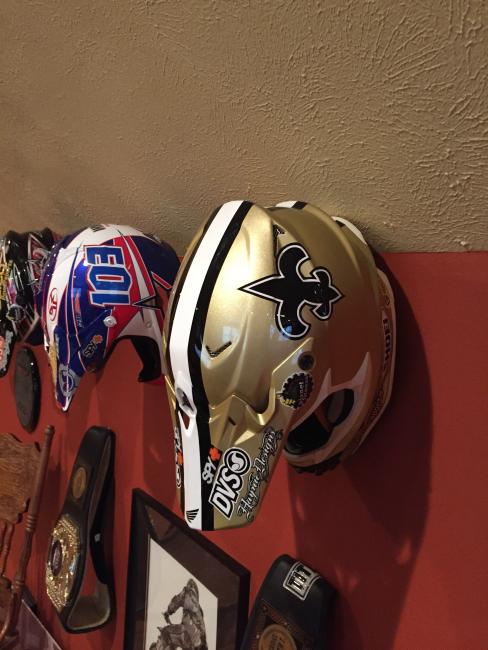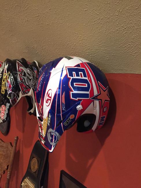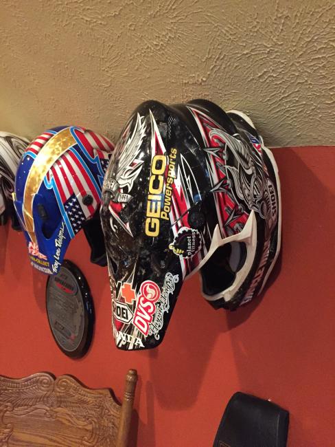 A couple of weeks ago, while attending the annual Party in the Pasture at Kevin Windham's home in Centreville, Mississippi, we got to take a tour through K-Dub's trophy room. Kevin had a long and successful professional career, and he was wise enough to hold on to a lot of his favorite memorabilia, trophies and riding gear. Above all, though, is his helmet collection. Windham kept pretty much every helmet he ever raced in, and has them displayed all along the walls of his trophy room (which is even bigger than you think it is).