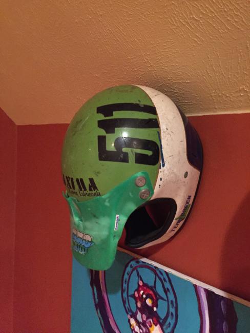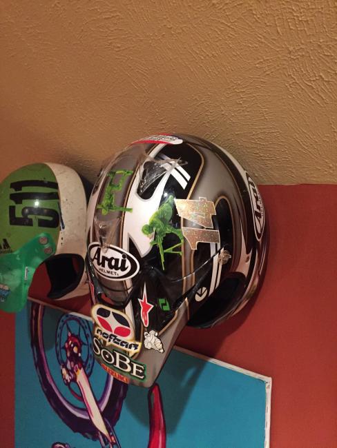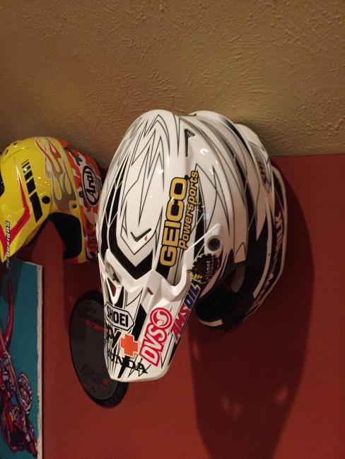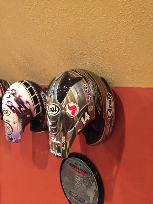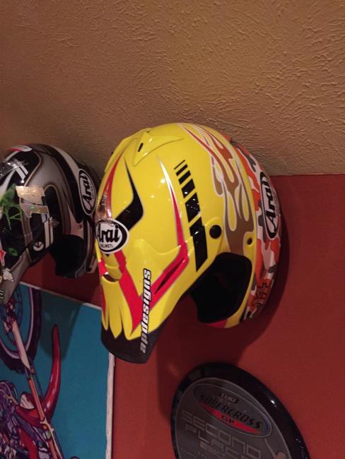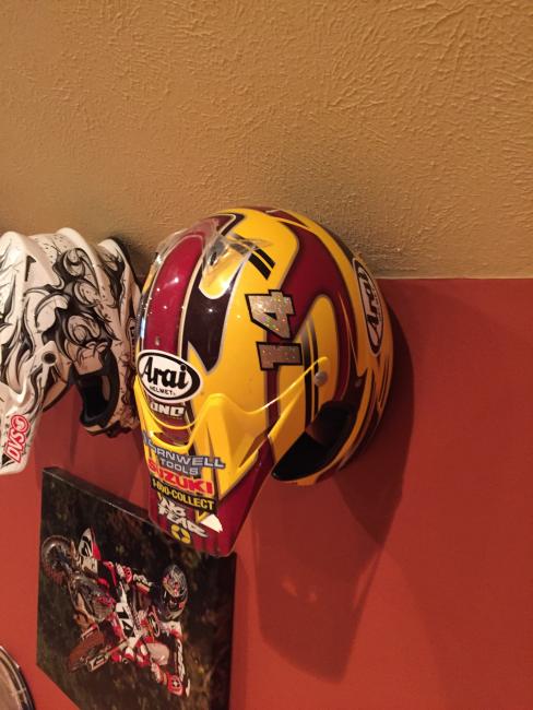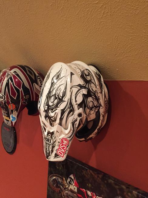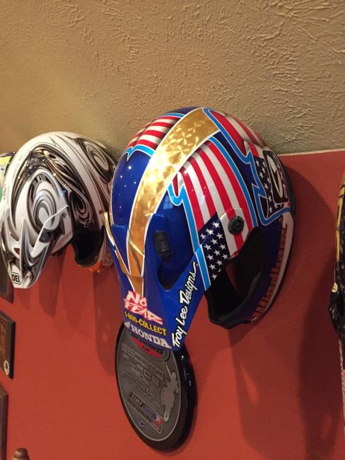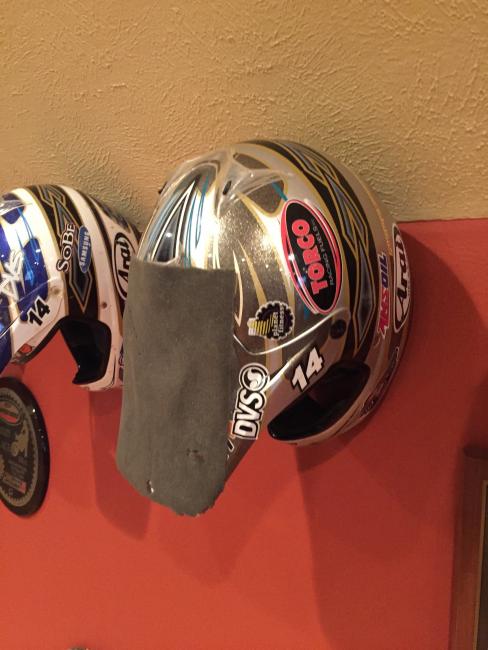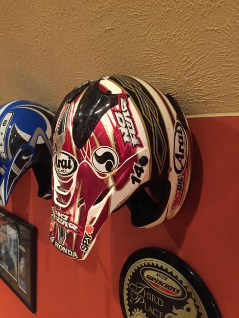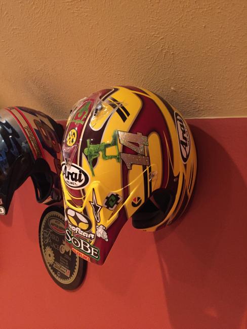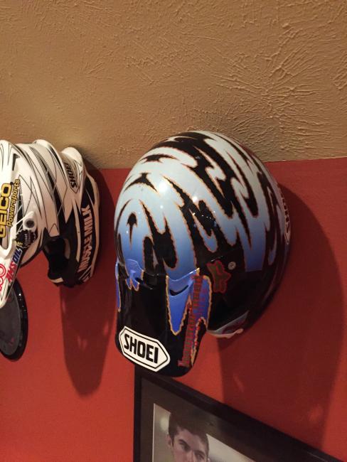 A couple of weeks ago, while attending the annual Party in the Pasture at Kevin Windham's home in Centreville, Mississippi, we got to take a tour through K-Dub's trophy room. Kevin had a long and successful professional career, and he was wise enough to hold on to a lot of his favorite memorabilia, trophies and riding gear. Above all, though, is his helmet collection. Windham kept pretty much every helmet he ever raced in, and has them displayed all along the walls of his trophy room (which is even bigger than you think it is).