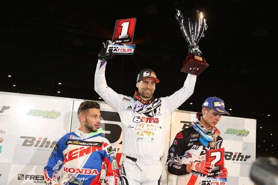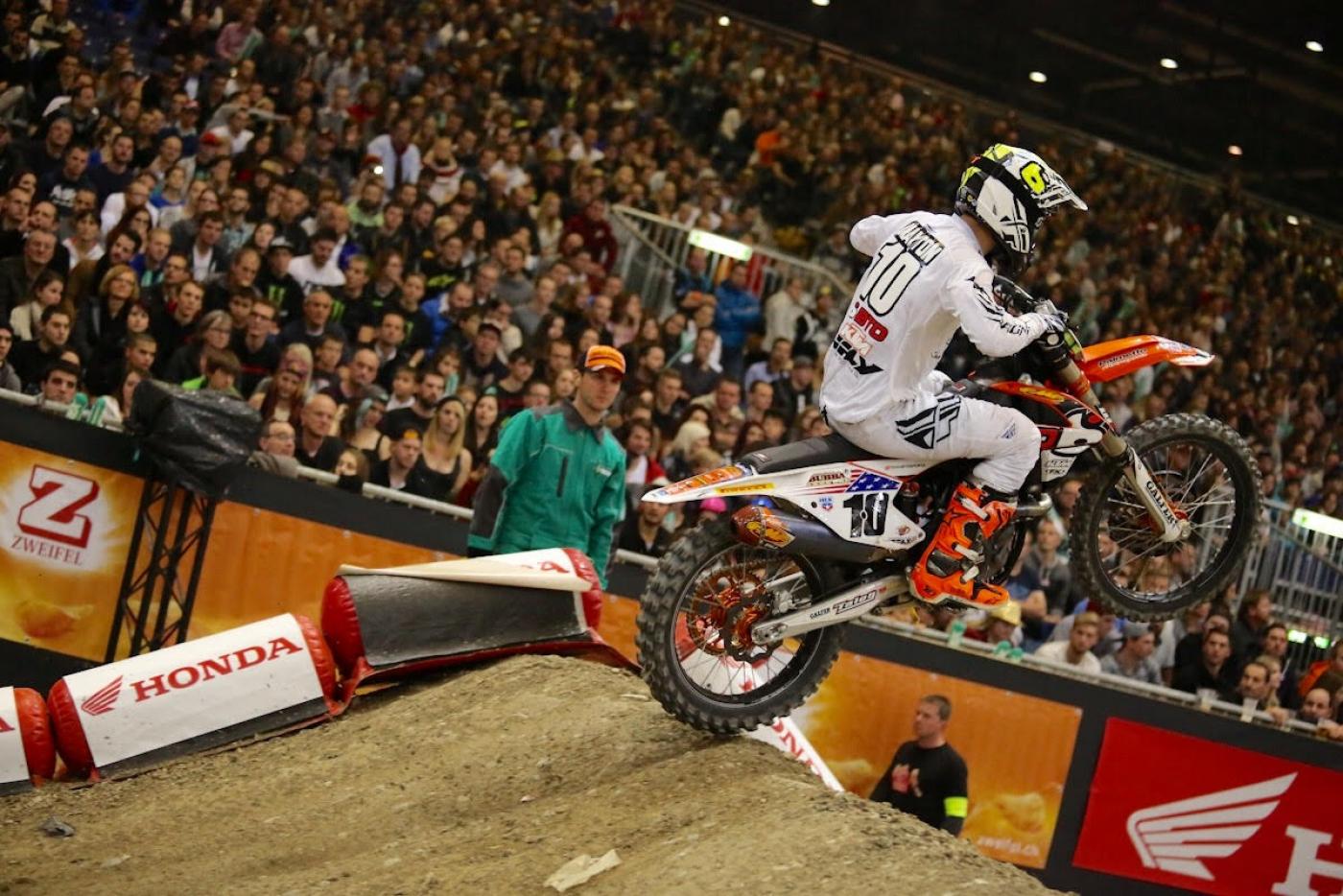 Over the weekend, the sun rose, the moon set, and BTOSports.com KTM’s Justin Brayton won another European supercross. This was in Geneva, Switzerland, and it’s the fourth time Brayton has taken King of Geneva honors. GEICO Honda’s Malcolm Stewart and Kawasaki Frenchman Fabien Iziord joined him on the podium. Steve Matthes talked to all three.