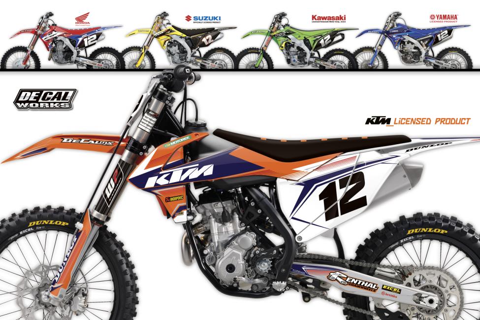 The logos are predetermined, so all you have to do is choose the base design colors. You can run all black if you wish, or run bright pink if that’s what you prefer. And it’s super easy. Seriously, I went on there this morning and designed a kit. (See my example below. I am design challenged, so don’t judge.) The kit includes decals for the radiator shrouds, swingarm, lower forks, front and rear fenders with the option to add number plate backgrounds and is licensed for all OEMs.