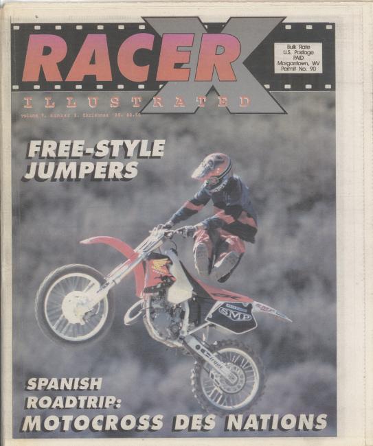 The latest issue of Racer X Illustrated is out: Volume 7, Number 9 (Dec '96). The cover is probably going to get some people talking: It's extreme sports rider Larry “the Wombat” Linkogle doing a no-footed can-can at a new competition that promoter Shane Trittler called simply Free-Style Motocross. The contest took place near Castaic Lake in California and attracted about one thousand fans, according to our contributor Eric Johnson.