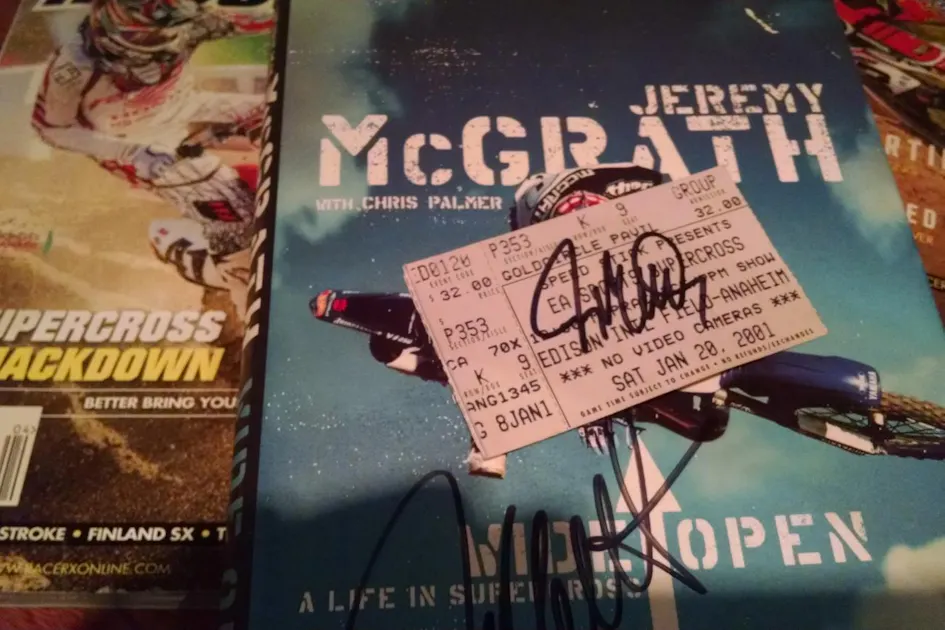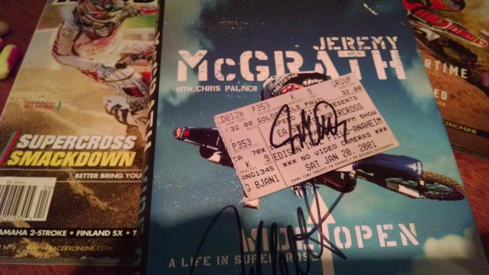 Little did I know the next time I saw McGrath win would be even better; it would be the last time it ever happened. It was January 20, 2001, and Ricky Carmichael had defeated McGrath the week prior in San Diego, setting the stage for an epic battle between the two. And with about five or six laps left, the fight everyone wanted to see started playing out. Carmichael caught McGrath and was challenging him everywhere, even getting by him briefly at one point, but McGrath hung on. The two main things I remember that night were being amazed at how crazy loud the crowd was for so long, and being on the verge of actual terror and panic several times when I thought RC was going to win. I was just about in tears when it finally ended! I still have my ticket stub from that night (pictured above), and I even got MC to sign it a couple years ago. Maybe this weekend I’ll go back to the exact seat and check out the view. If you see some moron screaming his face off staring at his phone in the cheap seats Saturday morning, don’t be alarmed, it’s just me reliving that crazy night via YouTube.