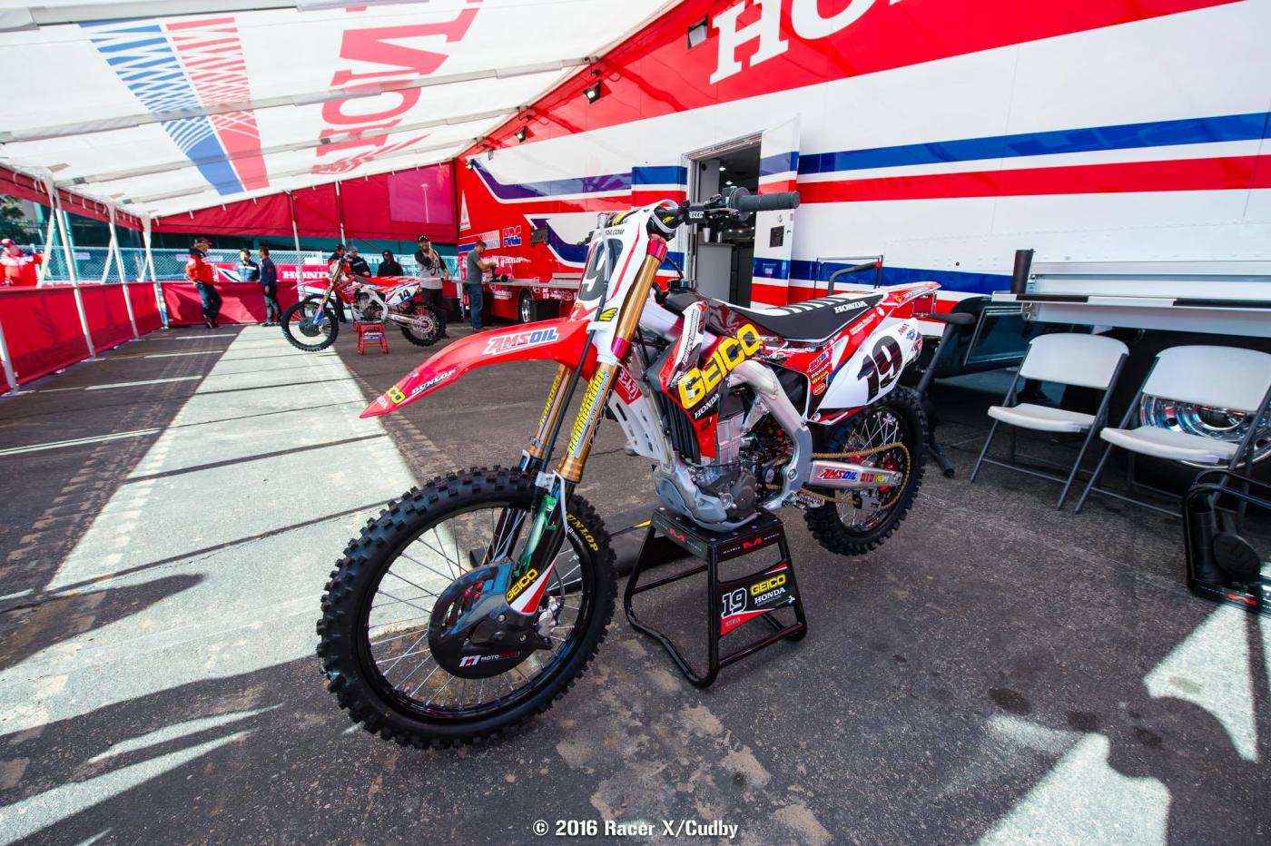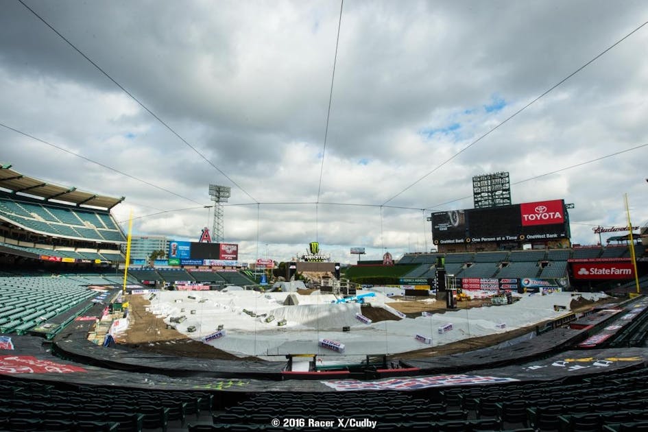 So finally, it’s time. The 2016 Monster Energy AMA Supercross Championship begins at Angel Stadium in Anaheim tomorrow. The off-season is over, everyone is tied in points, and the possibilities of some real drama are all there, underneath the white tarps that have covered the track since Dirt Wurx came to town. Fortunately—and hopefully this won’t jinx it—the weather has been much better than the heavy rains and storms predicted all week. It’s downright beautiful right now and is looking good for tomorrow.