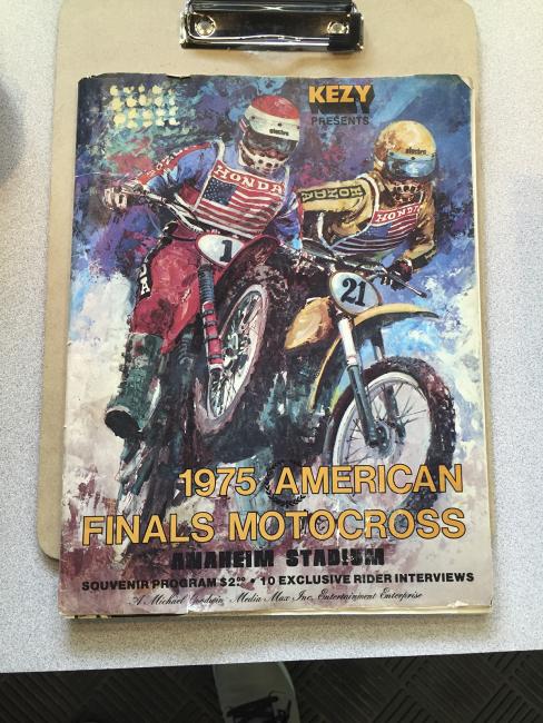 And then there was my belated Christmas present from Simon Cudby, which he gave me right before the press conference started. It was a souvenir program from the first Anaheim race, which took place in December of 1975. The race wasn’t a part of the AMA Supercross Series that year. Instead, it was called the American Finals Motocross. The book cost $2 and featured a painting on the cover of two Honda riders, albeit one on a yellow Honda. The event was produced by Michael Goodwin’s Media Max Inc. Entertainment Enterprise, and the title sponsor was a radio station, KEZY. The race was a one-off, run-what-you-brung stadium motocross. Eighteen-yea-old Tony DiStefano won on his factory Suzuki, though Team Honda’s Marty Smith turned the fastest lap time of the night on his RC125. There were Can-Ams and Bultacos and Maicos and CZs and Ossas and even a Jones-Islo, along with all of the Japanese bikes. There was a one-moto “High School” support class won by a kid named Broc Glover. The track itself ran out by the old Big A, which has since been moved. The promoter called the track “a man-made monster.” The attendance was optimistically announced as 23,000. I have yet to find any video footage from the race online, nor are the results in the Vault.