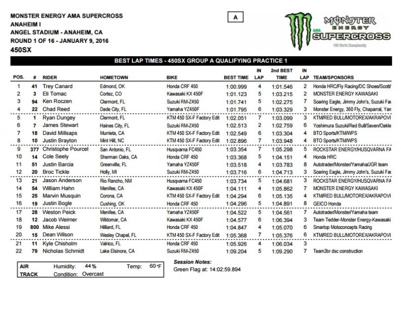 | 15 | Justin Barcia | 1:02.488 | +52.884 | Monroe, NY | Yamaha YZ450F | |