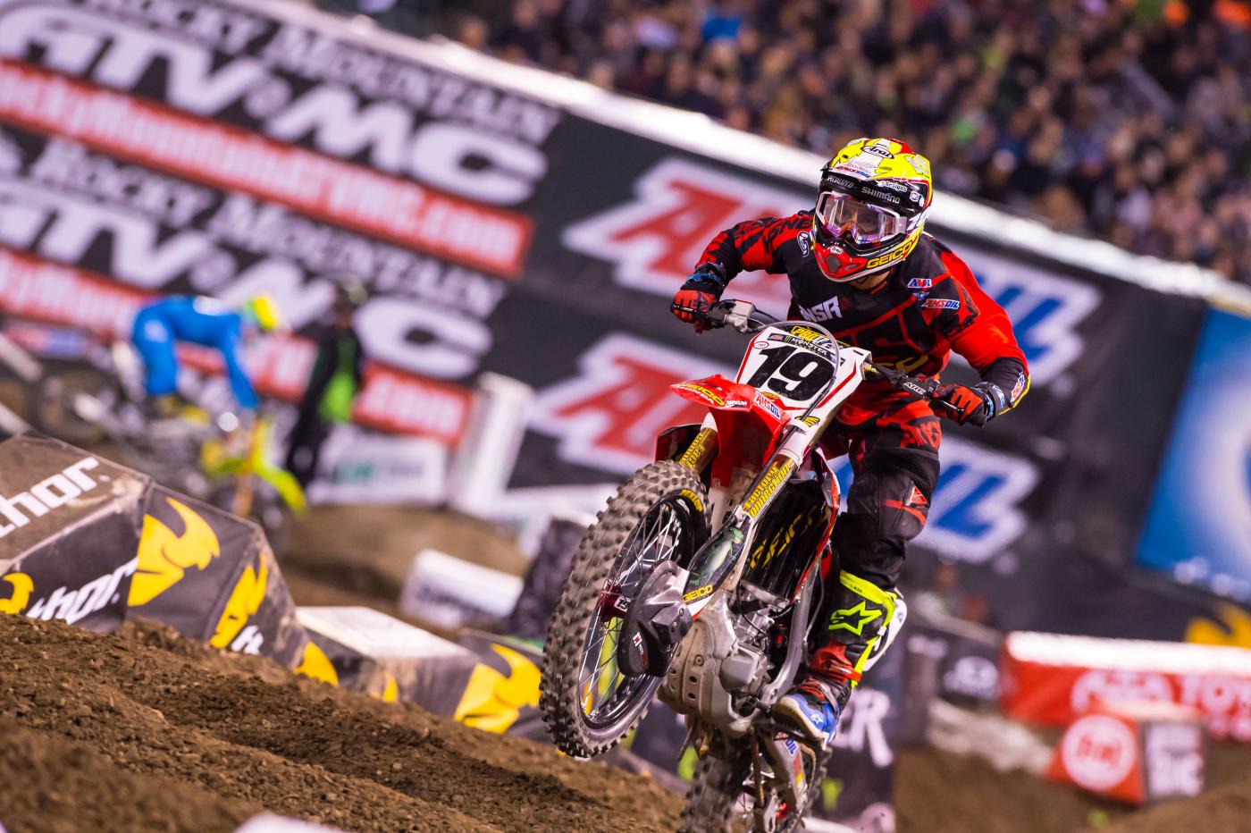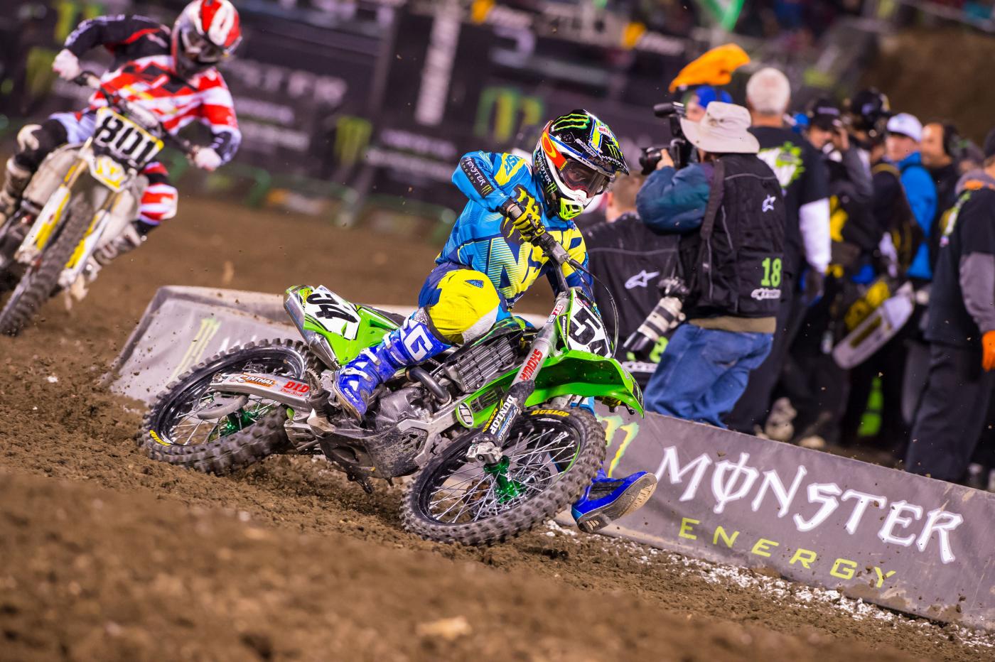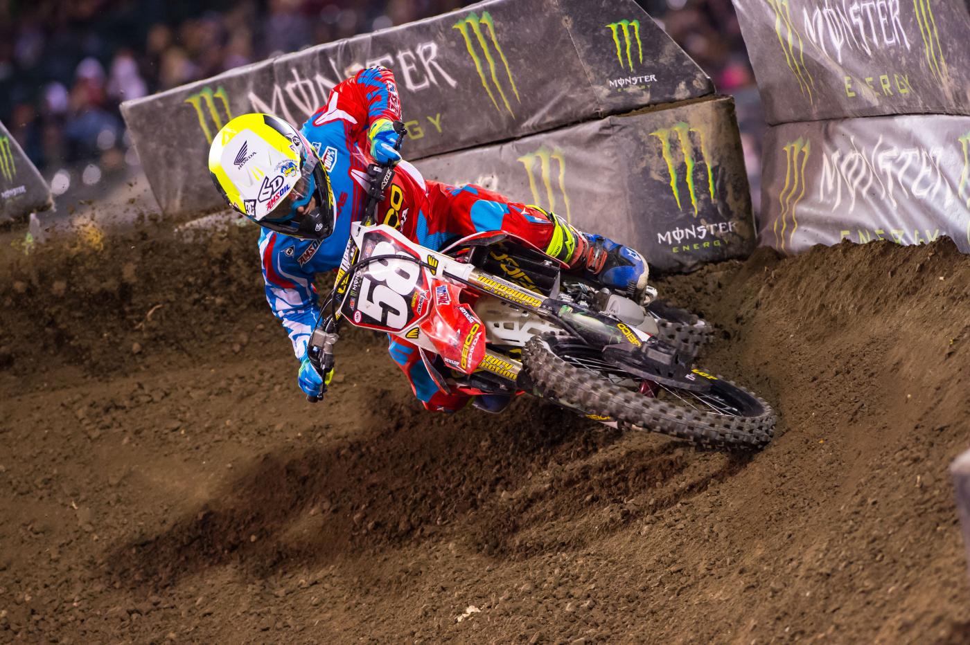 Got through the first one, really happy about that, but at the same time that was the most frustrating race of my entire life. My starts were good but I wasn’t really there speed-wise yet, and it got a little hectic. I learned a lot tonight. A lot. Main event was just tough, got a good start considering where I was at. It was hectic out there. This is a gnarly class! You saw it in the press conference on Thursday—what are there like fifteen with number one plates hanging on the wall? Coming in, the way I came in, whatever, I’ve been here before starting the season off with injuries. It’s not an excuse, but I haven’t done a twenty lapper in months. I haven’t raced against most of those guys ever. It’s okay. I feel like I can put it up there pretty soon. The beautiful thing is there are a lot more of these.