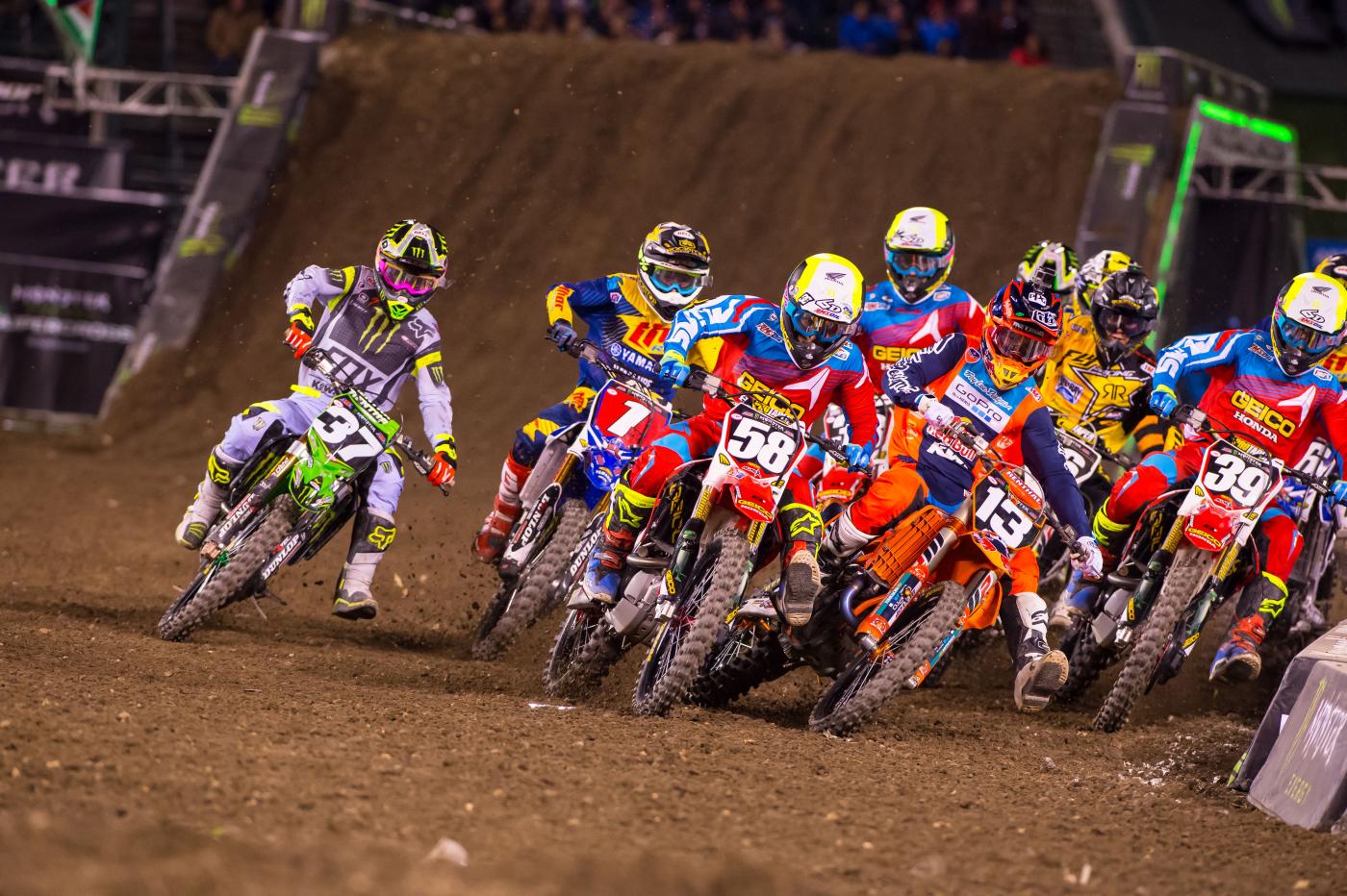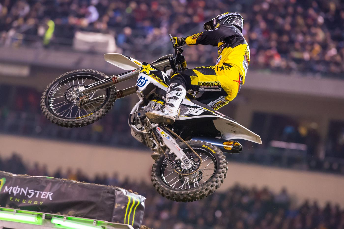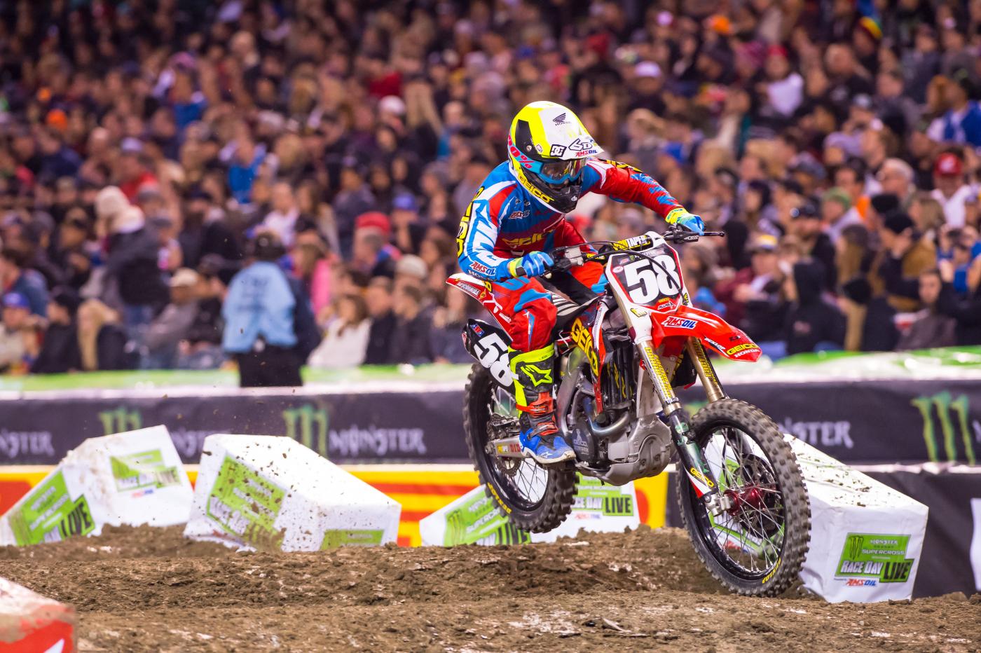 Got through the first one, really happy about that, but at the same time that was the most frustrating race of my entire life. My starts were good but I wasn’t really there speed-wise yet, and it got a little hectic. I learned a lot tonight. A lot. Main event was just tough, got a good start considering where I was at. It was hectic out there. This is a gnarly class! You saw it in the press conference on Thursday—what are there like fifteen with number one plates hanging on the wall? Coming in, the way I came in, whatever, I’ve been here before starting the season off with injuries. It’s not an excuse, but I haven’t done a twenty lapper in months. I haven’t raced against most of those guys ever. It’s okay. I feel like I can put it up there pretty soon. The beautiful thing is there are a lot more of these.