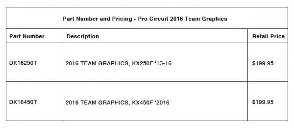 CORONA, CA - The Monster Energy/Pro Circuit/Kawasaki Team Graphics are now available for the 2013-2016 KX250F and 2016 KX450F models. The 2016 Team Graphic is designed to give your bike the "factory" Monster Energy/Pro Circuit/Kawasaki look and feature heavy-duty clear vinyl for all sticker components which will keep your kit looking new for a long time. Each high-quality screen printed kit contains all front and rear fender decals, tank/shroud decals, fork guard decals, air box, swing arm decals and seat cover. Part numbers and pricing listed below.