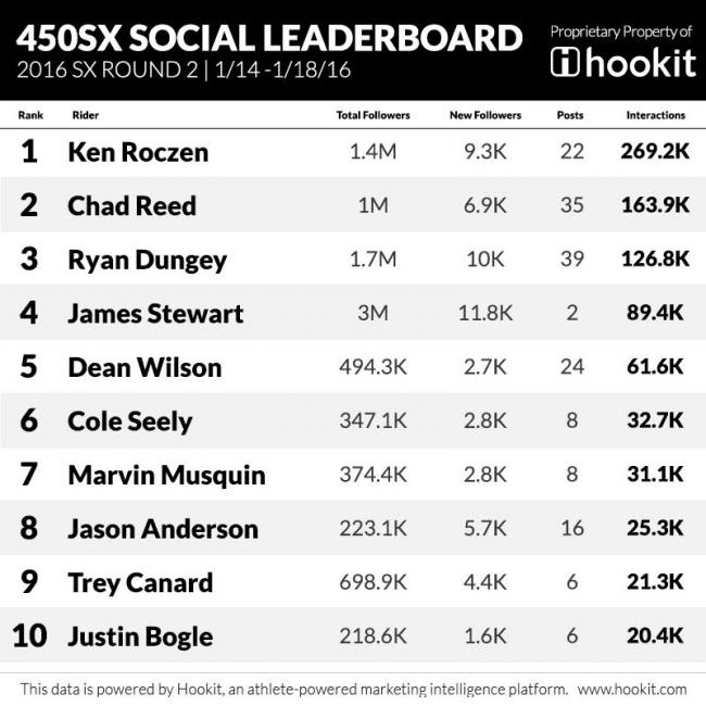 For a second consecutive week, Ken Roczen led all riders in interactions across social media (Facebook, Twitter and Instagram), according to Hookit.