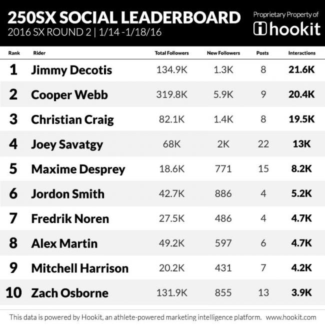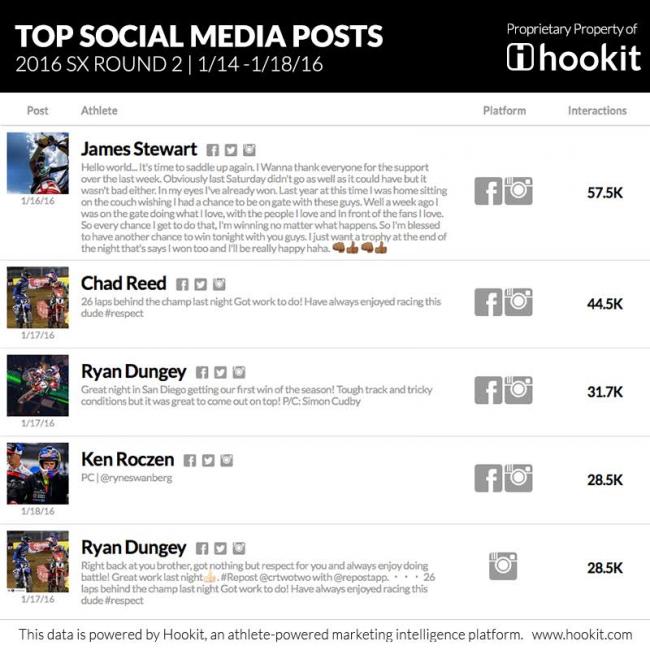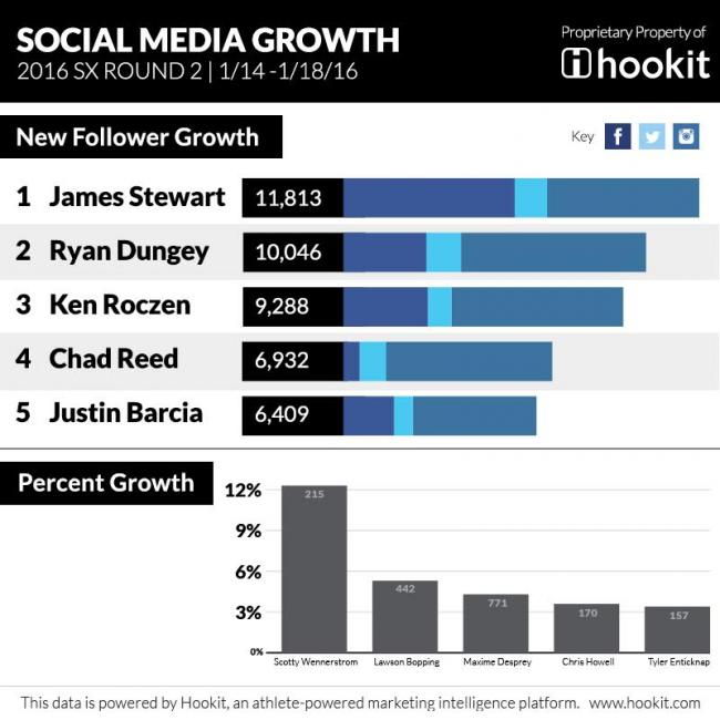James Stewart may have been fourth in interactions, but he picked up 11,813 new follows—tops among all riders. Dungey, Roczen, Reed and Justin Barcia were all in the top five.