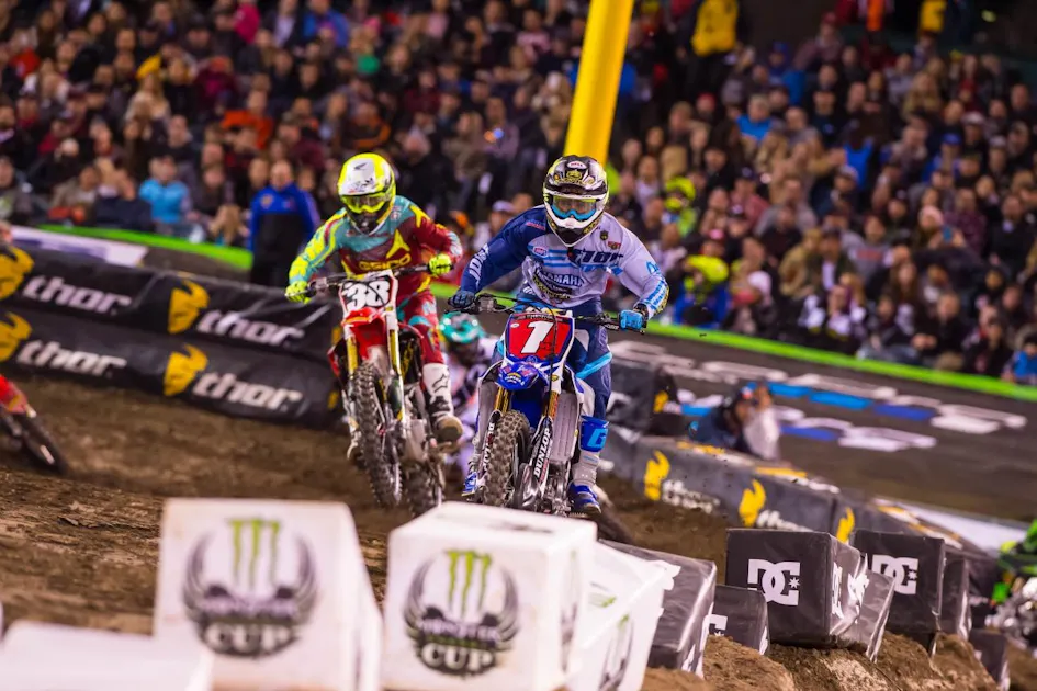 In the main event, Cooper rounded the first lap in fifth place. Not a terrible starting position, but his fiercest rivals were positioned in front of him. He hadn’t had the greatest of days thus far, so I was curious to see how it panned out. And did I mention that Christian Craig had jumped into the lead? It was an interesting scenario for him to have to work to the front. Webb didn’t panic, though, and slowly moved past Zach Osborne and eventually by a downed Joey Savatgy and into second place, setting his sights on GEICO Honda’s Craig. After such a spirited chase in the heat race, Webb had to be a bit worried about Craig once again fending him off. As he slowly crept up on Craig’s rear wheel, I wondered where and how he would make the pass stick. In the heat race, the taller, lankier Craig simply had Cooper’s number in the whoops. He could consistently put time on him there, and it put pressure on Webb to close the gap on the rest of the track. Essentially, Craig just had to keep Cooper at bay until he could get that advantage back, or so he thought.