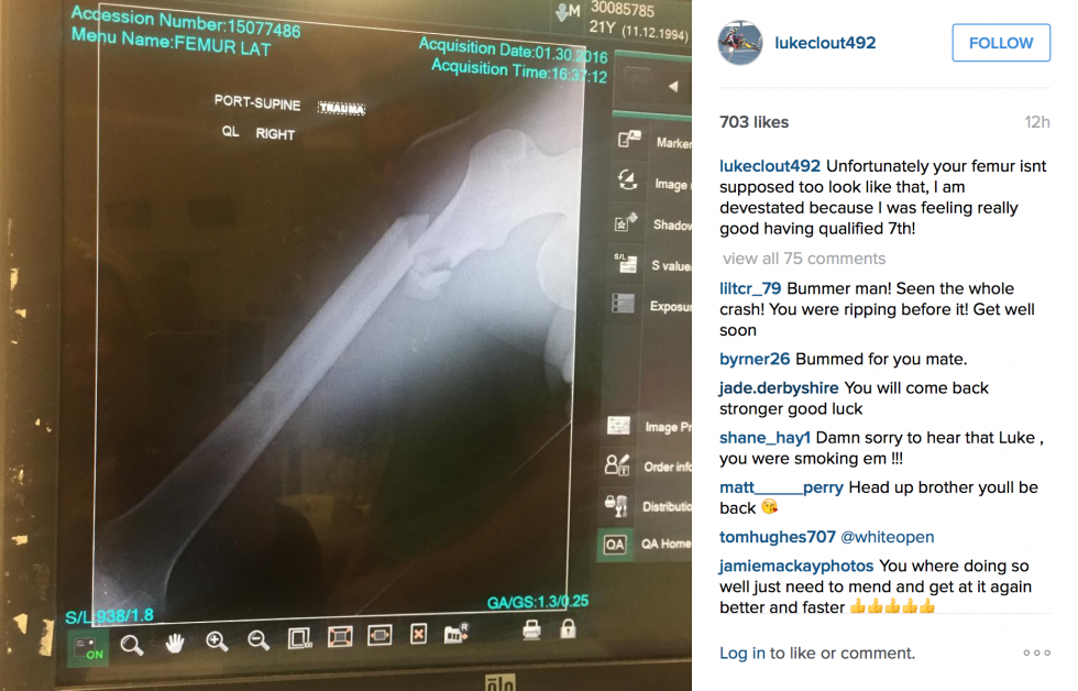 “Unfortunately your femur isnt supposed too look like that, I am devestated because I was feeling really good having qualified 7th!,” he wrote on Instagram.