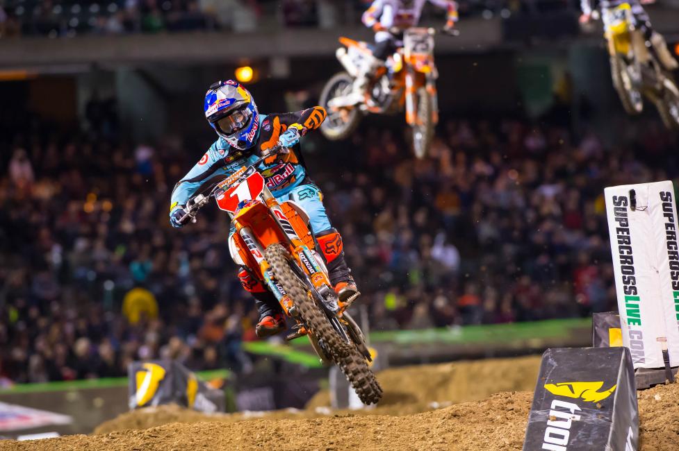 Ryan Dungey: I felt good. I think first and foremost just getting off to a good start. This track, there wasn’t really a lot that separated the guys. You could kind of tell that. You weren’t going to make a lot of time unless they made a mistake or you started making a tenth or two a lap. But I got up front and was able to ride my own lines and hit my marks and try to limit the mistakes. A couple swaps here and there but everything felt good. I think the heat race really helped us out, too. Getting the heat race win and having the fastest heat race we had the first gate pick. So that’s really I think critical going into the starting gate and being able to choose from whatever gate you want. So that was nice, and a good start. Bike felt good tonight. Just tried to limit the mistakes and open up a little bit of a gap if we could.