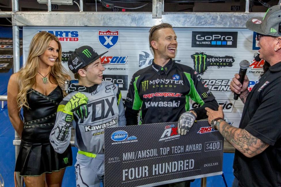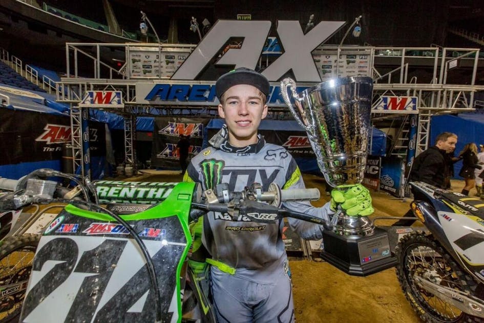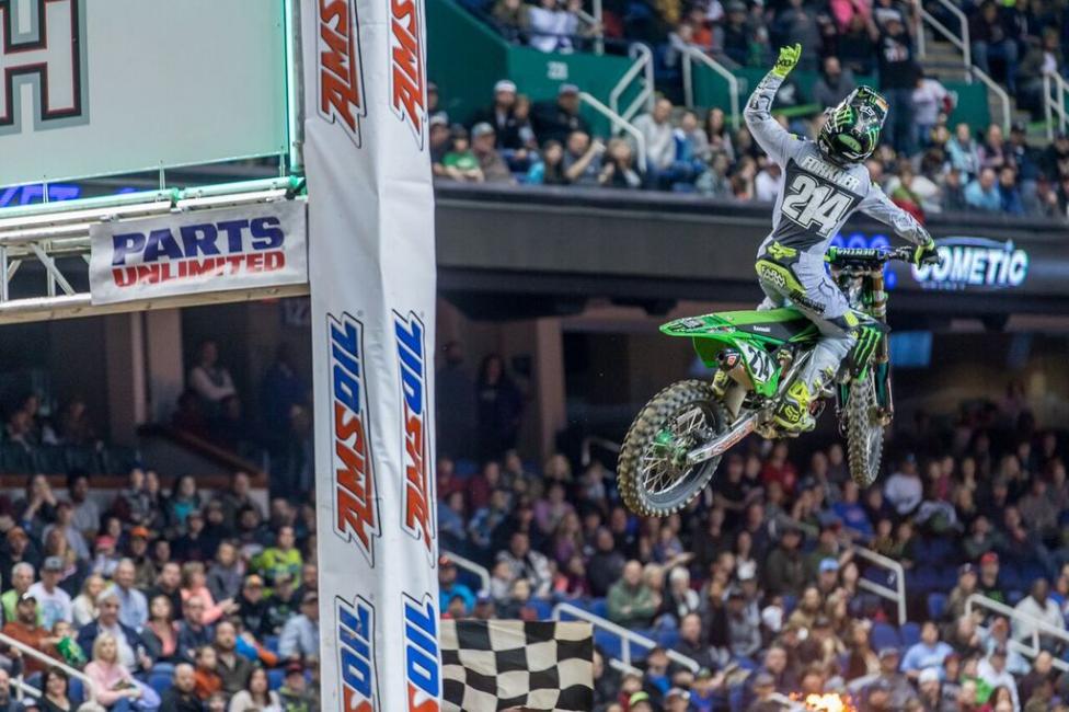 Mission accomplished and baptism by fire completed. This past weekend at the Greensboro Coliseum in North Carolina, Team Monster Energy/Pro Circuit Kawasaki prodigy Austin Forkner managed to, one, win both 15-lap Amsoil Arenacross Class main events, and two, make the grade and complete his journey in Ricky Carmichael’s Road to Supercross. Now with the requisite points needed to go supercross racing in 2017, the 17-year-old sensation can now leave the hockey and basketball arenas of America behind him as he begins looking toward the starting gate of the Hangtown National this May and the launch of his career in the Lucas Oil Pro Motocross Championship.
