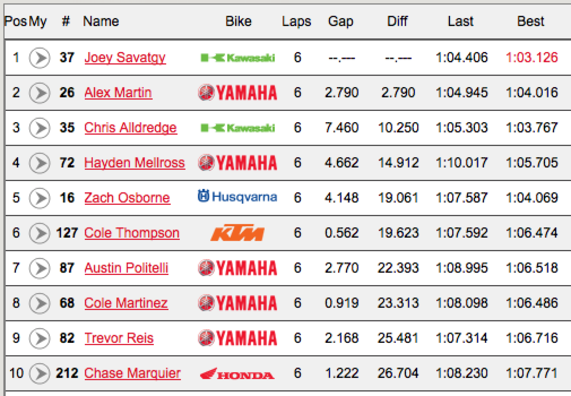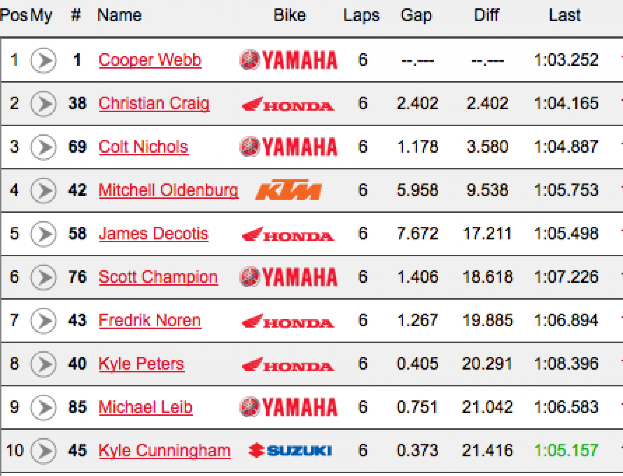 250s: Cooper Webb is angry! He's riding without the red plate for the first time this year and out for revenge, crushing everyone with a 1:03.4 lap, second best was the very impressive Colt Nichols at 1:04. Great lap for Nichols, but that's also a heck of a gap between Webb and the field.
