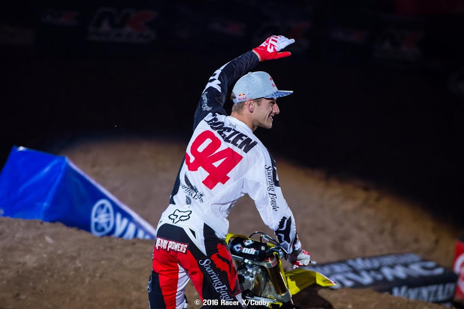 The field finally got what they wanted, and needed: a bad start for Ryan Dungey. The champion started about 11th, while Davi Millsaps, Ken Roczen and Eli Tomac were up front early. Roczen wasted no time getting into the lead. Then on lap three Tomac took second from Millsaps. Dungey had work to do and the fastest riders in the series were around him—Jason Anderson just behind, Chad Reed and Cole Seely just ahead. Dungey took the measure of Reed in the corner outside the stadium, then he was on both Millsaps and Seely on lap five in a three-way fight for third fourth and fifth. Ahead Roczen began to distance from Tomac.