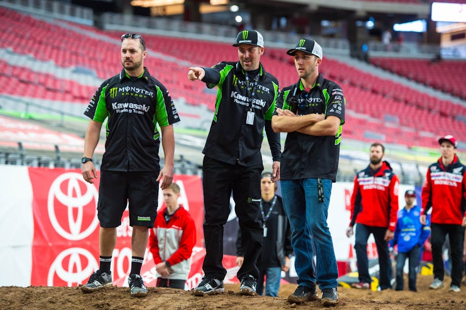 Late that night in Oakland, there was still activity in the Monster Energy Kawasaki pits. Normally everyone would have packed up and left, but all the team heavies, along with Tomac and his dad John, were standing in a circle, serious faces on all, trying to figure out what was next. Then came three long days at the test track last week to try to find the solution.