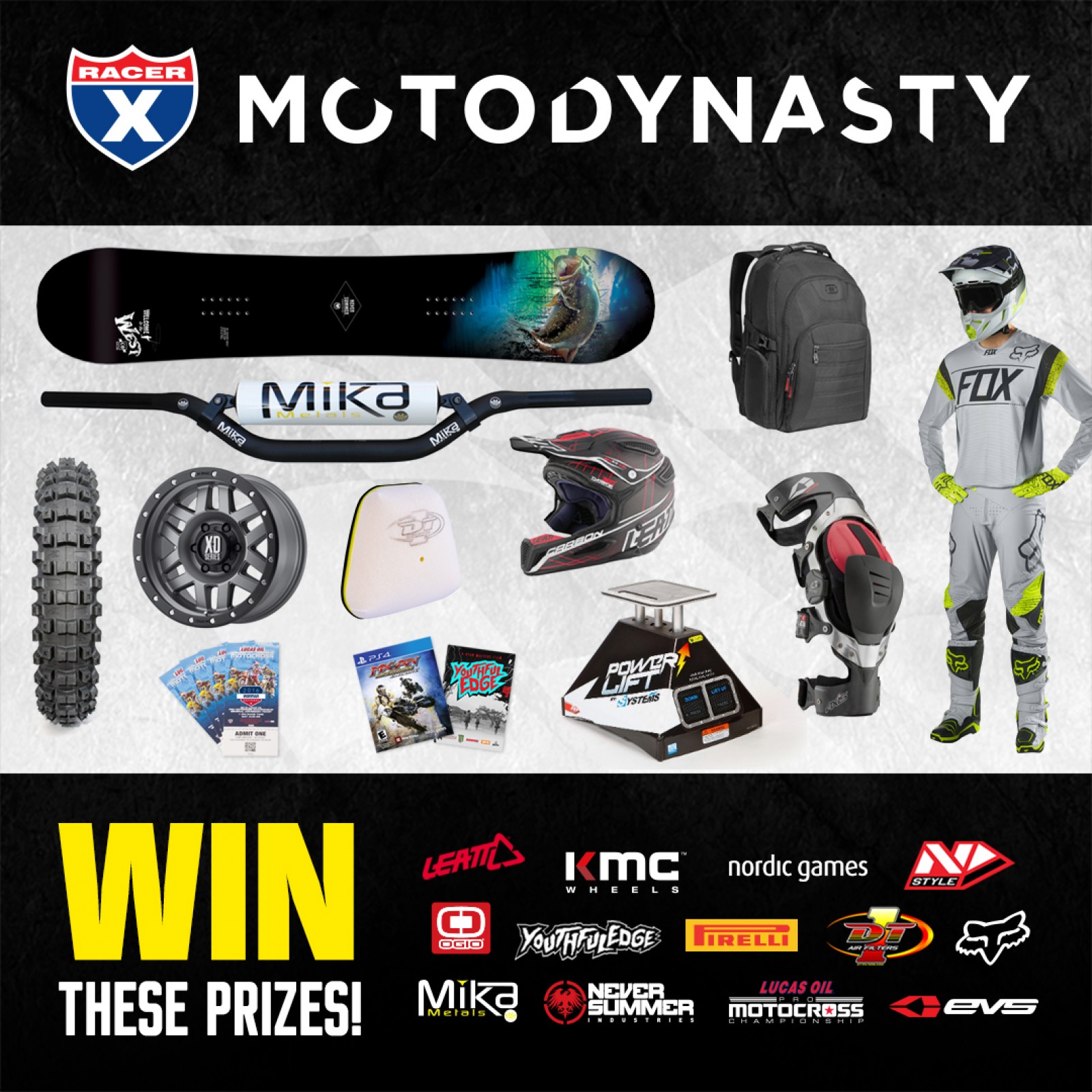 Winner: Head to toe Fox Racing set (V4 helmet, AIR DEFENCE goggles, FLEXAIR pants, jersey and gloves and Instinct boots )| Mika Metals handlebar, grips, brake pads, chain, and sprocket combo