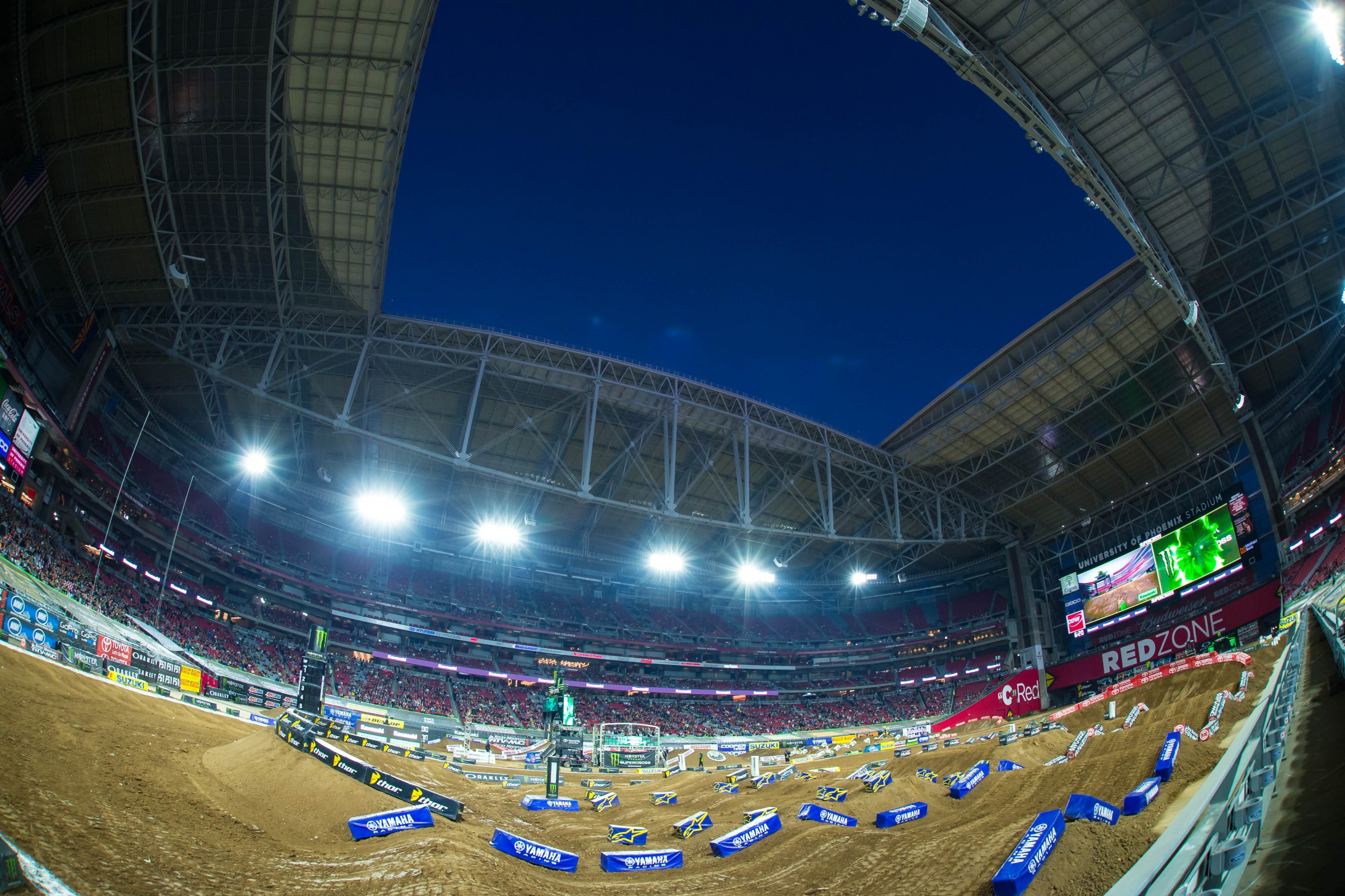 For sure, that was super fast. You know, it’s a fantastic stadium—it was all new to me. The building staff really wanted the event and they were great hosts. The footprint of stadium is 40 percent longer than your normal football field. Normally, most [football] stadiums are 80,000 square feet. But Glendale has an extra 35,000 square feet on that one end zone. So when we looked at it, [Feld’s] Dave Prater was into the crazy long start. We normally just don’t have the room to do something like that. But then we also had some fast rhythm lanes. For TV, we have to keep lap times right around one minute so we can fit all the racing into the night’s broadcast. When they first started riding, lap times were around 1.05 or so, but by the end of the night, they were down to the one-minute mark. TV got a little nervous. But I told them, if you have that luxury of space, we gotta use it. It was fun, and the whole time we were there, we were kicking around ideas for next year.
