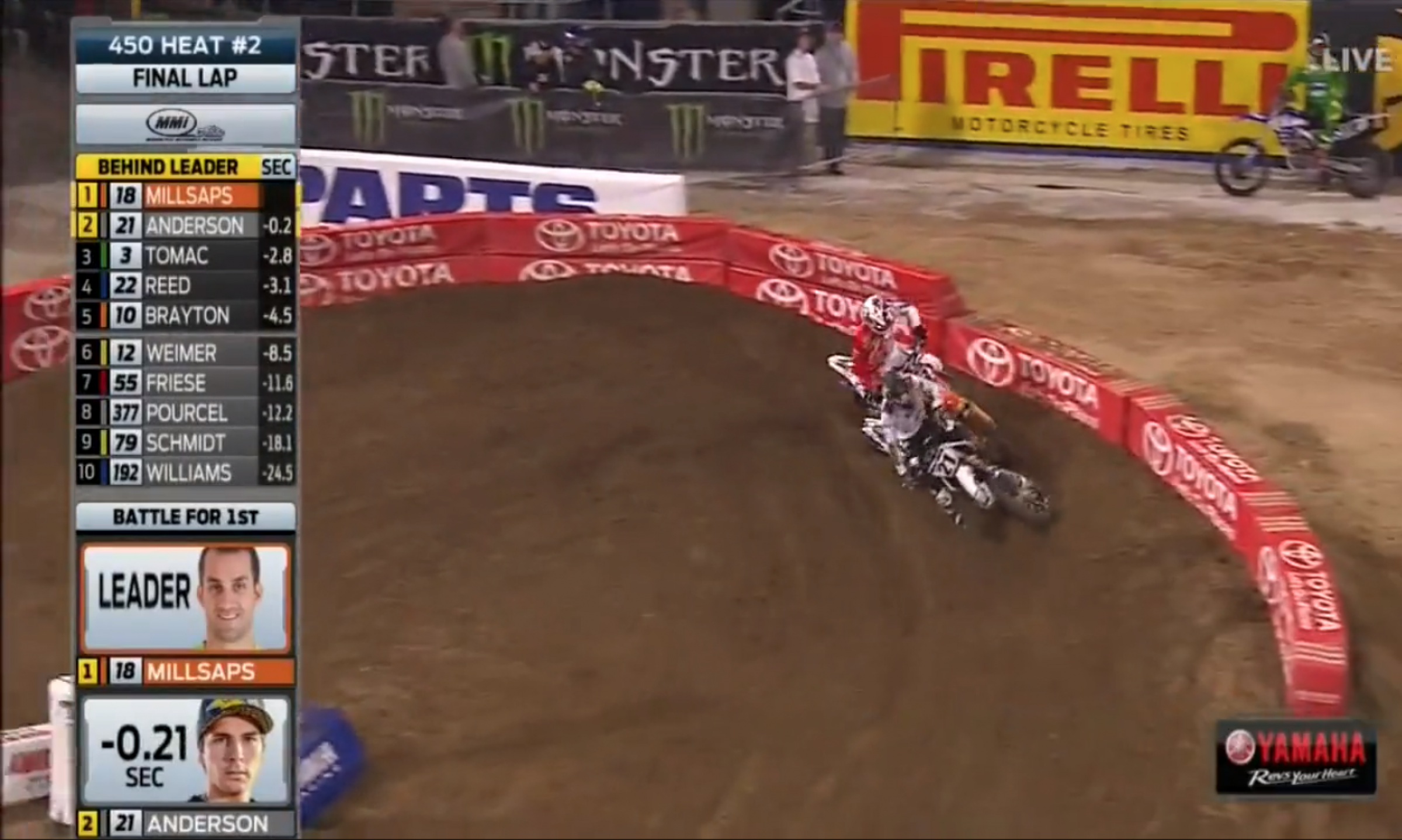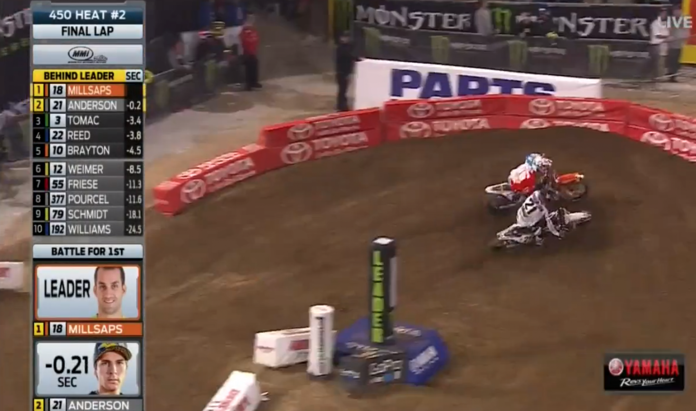 Halfway through he was into third with BTOSports.com KTM teammates Justin Brayton and Davi Millsaps in front of him. Brayton and Millsaps slowed each other up, and Anderson, determined to match Dungey’s heat win from earlier, went for the kill, trying to pass both riders in one corner. He made some contact and Brayton ended up off the track, going from first to fifth—and the semi—in one fell swoop.