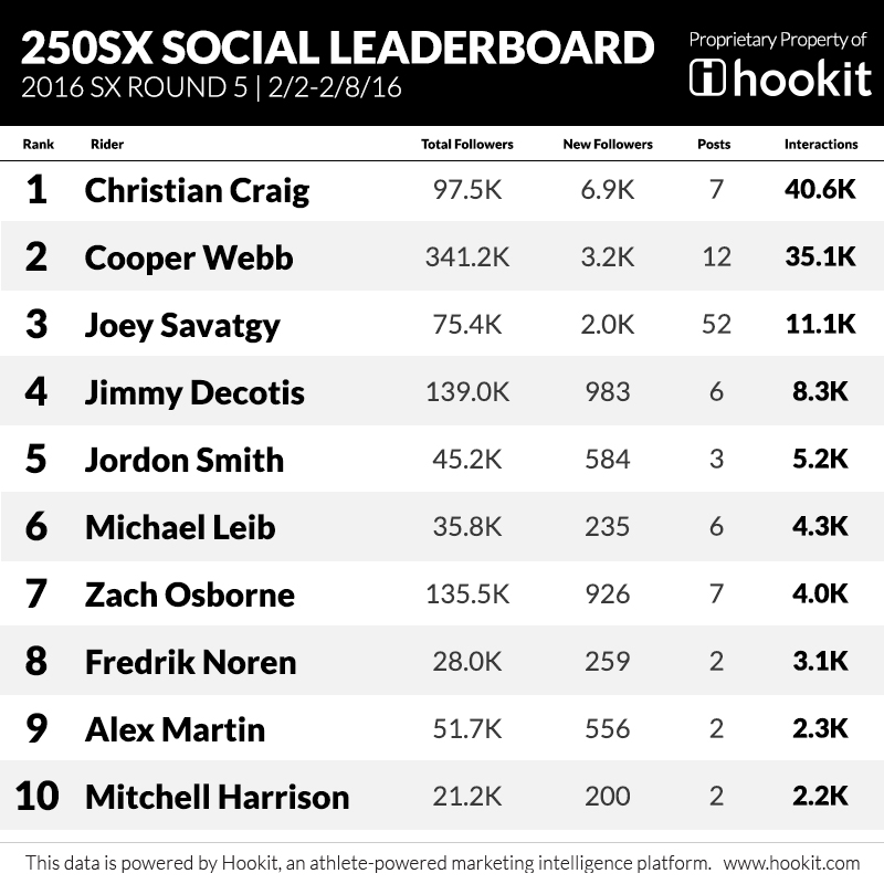 With his win, Christian Craig took the top spot in 250SX with 40.6K interactions. Cooper Webb was second with 35.1K. Joey Savatgy was a distant third with 11.1K.