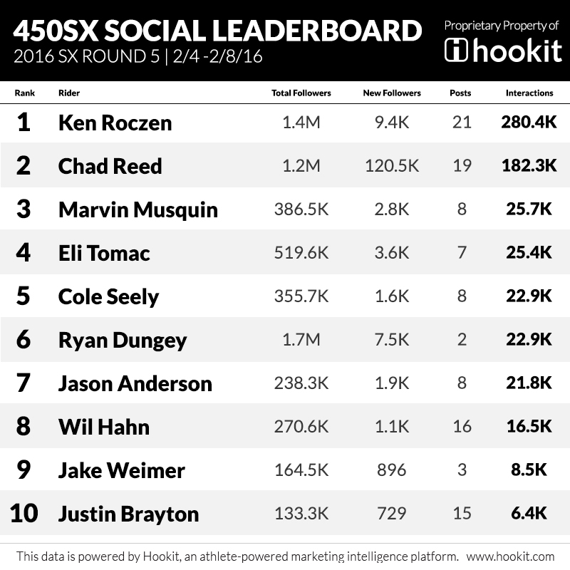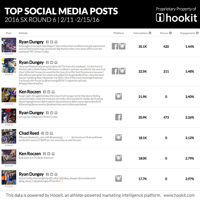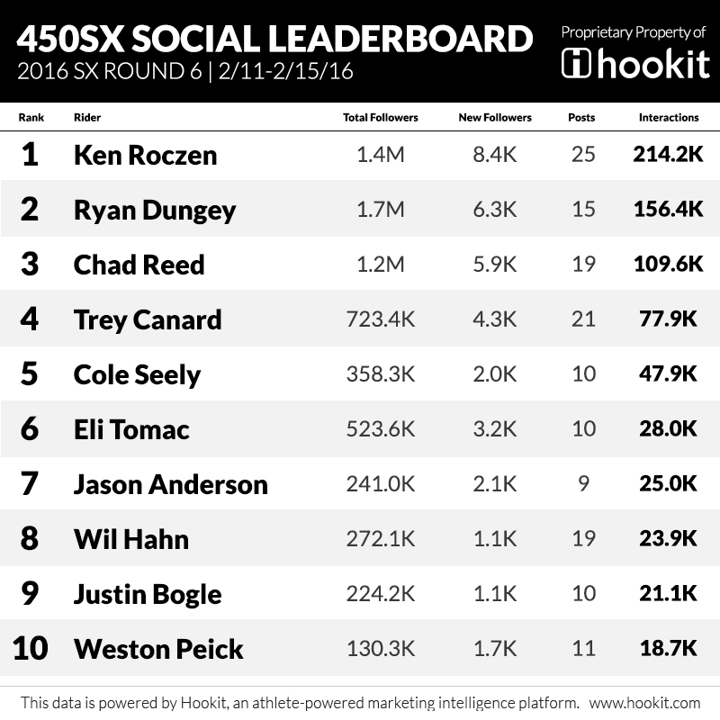 Ryan Dungey jumped back to second last week (and his posts rose from two to fifteen) with 156.4K interactions. Roczen was tops again, with Reed in third.