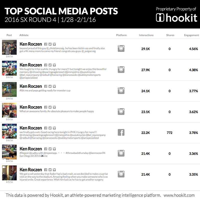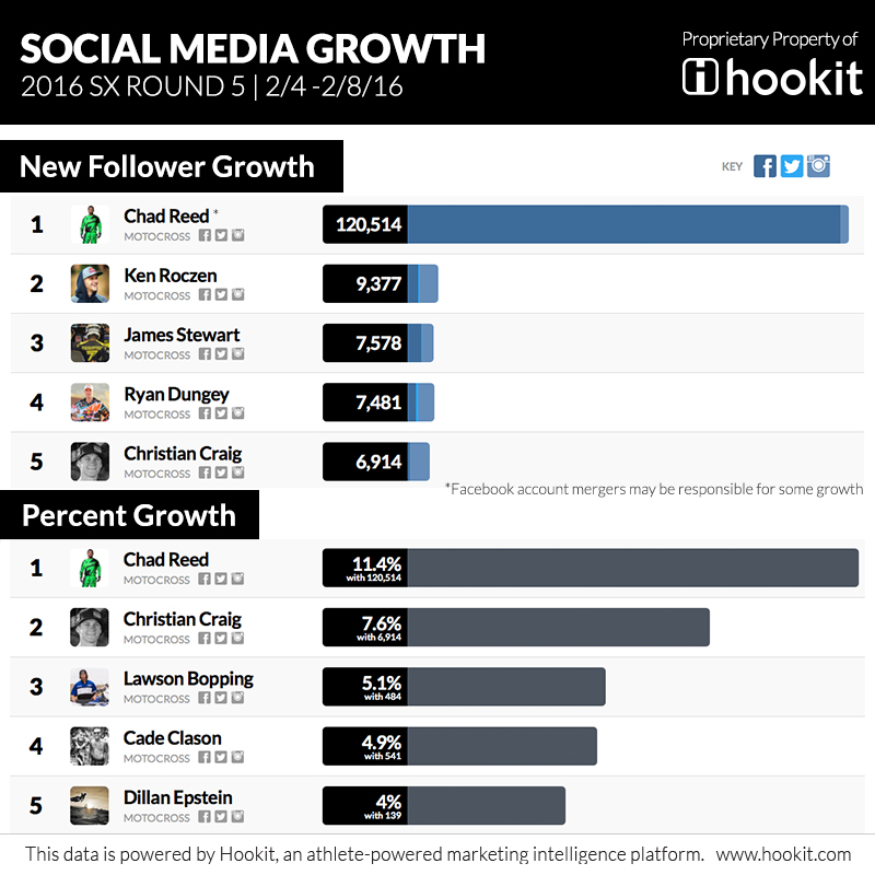 Another interesting development was Chad Reed gaining a growth of 11.4 percent. That’s a big number. Meanwhile, Ken Roczen had the top seven most popular posts out of any rider.