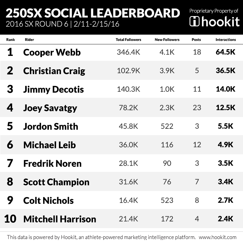 In his win at Glendale, Christian Craig had 40.6K interactions with seven posts. After a third at San Diego 2, he had 36.5K interactions on five posts. Cooper Webb was back on top with 64.5K interactions. Jimmy D was third with 14K interactions.