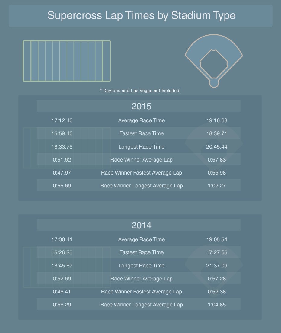 So far we’ve had four out of five races at baseball stadiums (Oakland is both football and baseball), and we’re moving into a stretch where nine of the last ten races (not including Daytona) are in football stadiums. The prevailing wisdom is the football stadium tracks are longer, and they may be in square footage, but the riders also have more speed. Whatever the case is, new PulpMX Show producer Travis Marx (Twitter: @imtravismarx) ran the numbers for me in terms of lap times, and the baseball stadiums produce longer lap times.