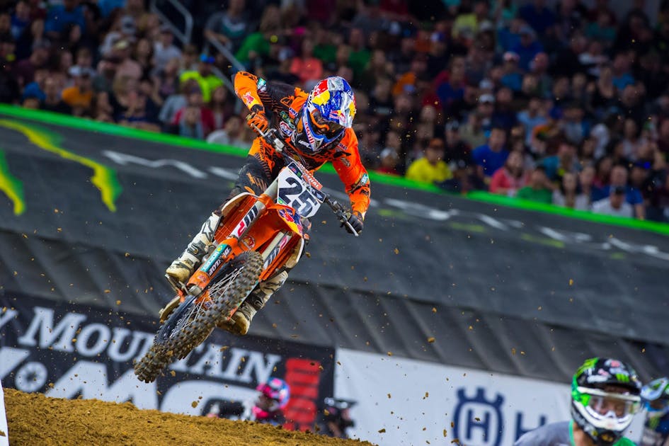 Marvin Musquin: Yeah. It’s so easy to say, if I were to get a start, or not go down, stuff like that. It was a tough day but it was to me my best day. First practice right away I felt pretty good. We made some changes on the shock this week. We tried it today. First qualifying I got first. I was like, “Man, that’s awesome!” And then second qualifying I got second. Ryan [Dungey] got me by a really little, not even a tenth of a second. So it was awesome. And then heat race, I needed a good start. That start was so short and the track was really technical. I was mid-pack. I got up to maybe fourth and fifth. Everybody was so aggressive and [Trey] Canard took me down. He went inside of me under the tunnel and took the line and then he hit me and I went down. So it was a bummer not to qualify right away. To get top four in the heat, I got used to it. I was a little bit mad, obviously, because the gate pick was so important tonight. I went to the semi and got second. Even second place in the semi you ended up tenth or twelfth gate pick for the main. I chose to go inside. It was really tight inside and I didn’t get a good jump. I was mid-pack and in the first turn [Eli] Tomac was inside of me. He just hit my handlebar and then I went down. Dead last, I was so bummed. Obviously very first lap when I was dead last I was like, it’s going to be tough to get a top ten or to just come back. That track is so tight. Everybody’s riding pretty good tonight. I ended up having some good lines and I was happy the way I was going through the whoops and ended up sixth. With more intensity on the last five laps I would say I could have caught Tomac. So to me it was a good race the way it went. But that’s not what I want. But the way it went it was good.