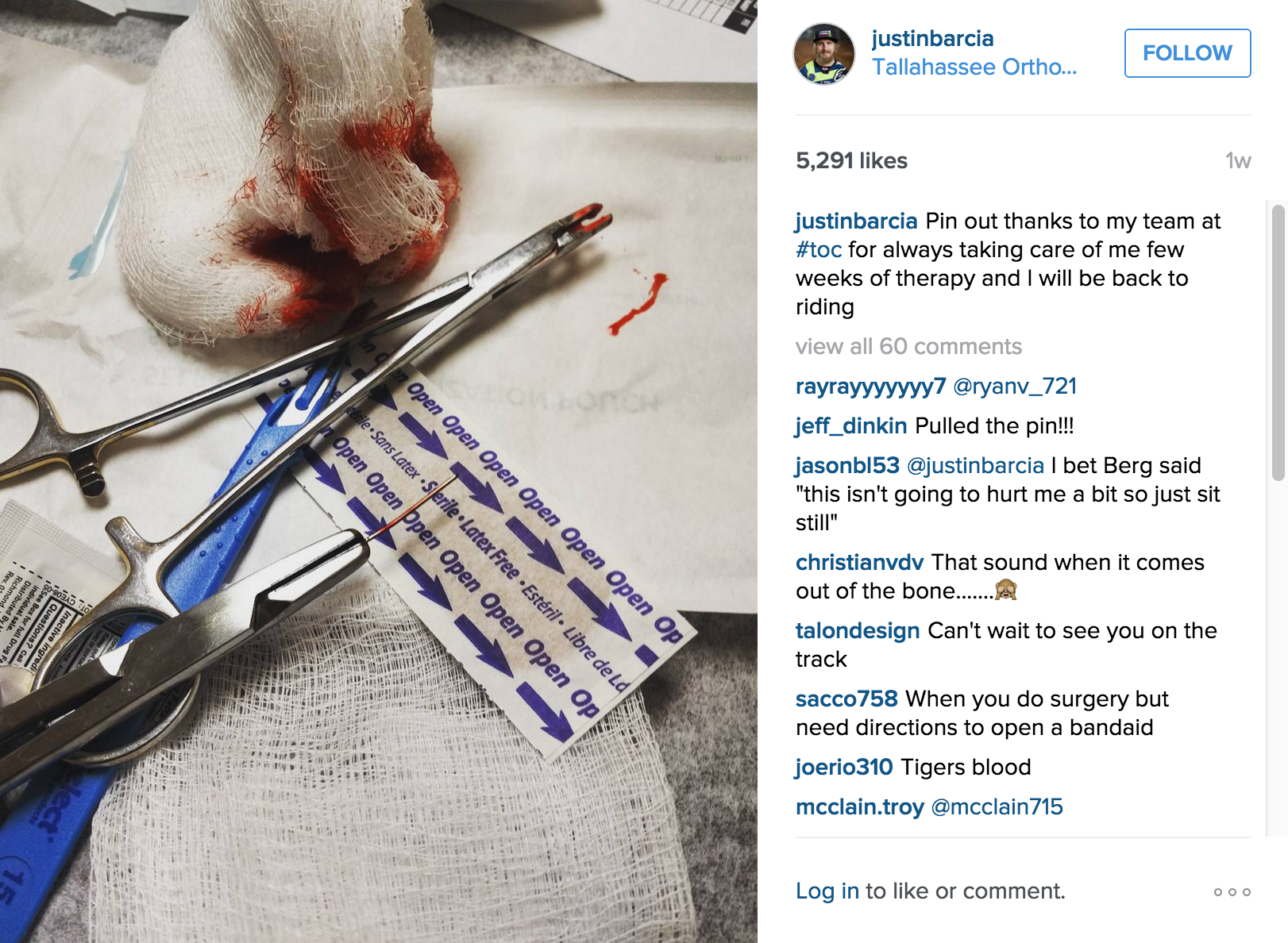 Comment: Barcia crashed on his mountain bike and injured his thumb before the season. He had surgery earlier this year. In an Instagram post last week, Barcia said he had the pins removed and hopes to start riding soon.