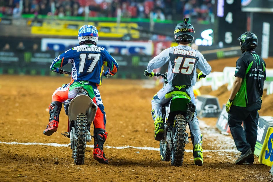 But the general idea didn’t come down from the NASCAR marketing offices in Daytona—it came from Andy “Rev Up” Bowyer, former columnist on this website, former Team Green rider, and now an employee of the supercross promoters at Feld Motor Sports. Clint Bowyer is Andy Bowyer’s brother, so Andy has a unique double-connection to each sport, and with NASCAR drivers and teams looking more closely at supercross than ever, and Fox Sports airing both sports, and NASCAR being in town for its own race in Atlanta….well, Andy started making calls.
