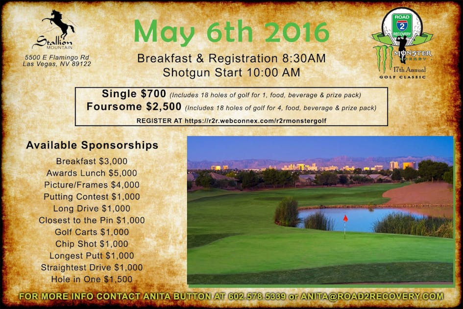 Encinitas, CA -The Road 2 Recovery’s largest fundraiser of the year is coming up. This year’s 17th Annual R2R Monster Energy Golf Classic will be moving to the beautiful Stallion Mountain Golf Club in Las Vegas Nevada, just minutes from the strip and Sam Boyd Stadium. Everyone is welcome so we hope you can join us in this legendary tournament.