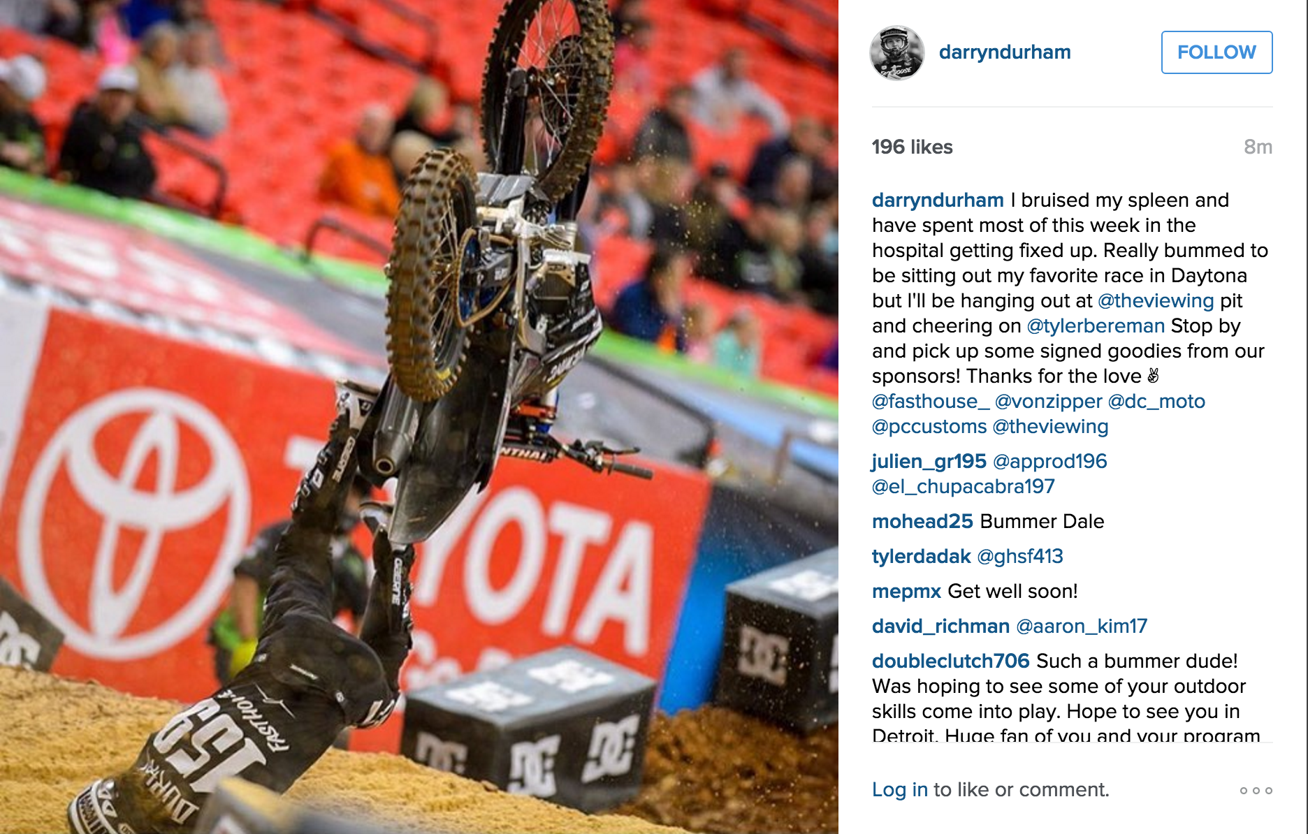 Darryn Durham released a statement today on Instagram announcing that he would miss round nine of Monster Energy Supercross at Daytona after bruising his spleen in a crash at the 250SX East Region season opener in Atlanta last weekend.